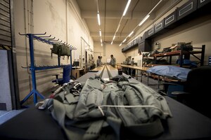 U.S. Air Force Airmen assigned to the 86th Operations Support Squadron Aircrew Flight Equipment prepare to pack a personnel parachute on Ramstein Air Base, Germany, Oct. 24, 2017. Due to the thorough process, it can take hours to pack a single parachute. Aircrew Flight Equipment uses their space to