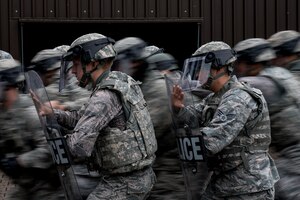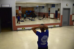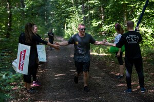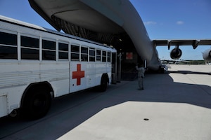 U.S. Air Force Maj. Eric Doggett, En-Route Patient Staging Facility flight commander, speaks to an ambulance bus driver during a patient movement on Ramstein Air Base, Germany, July 13, 2017. The ERPS primary mission is to care for injured service members in transit from deployed locations to the