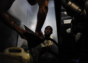 Airman 1st Class William Woodside, 786th Civil Engineer Squadron electrical power production apprentice, drains coolant out of a generator system on Ramstein Air Base, Germany, June 27, 2017. The preventative maintenance provided fresh fluids to prevent the system from malfunctioning during a