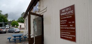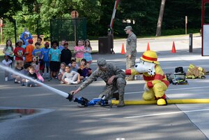 Sparky, 86th Civil Engineer Squadron fire prevention mascot, extends emotional support to Airman 1st Class Derek Kildow, 86th Civil Engineer Squadron firefighter, as he demonstrates how to use a fire extinguisher at Ramstein Elementary School’s June Bug Out field day on Ramstein Air Base, Germany,