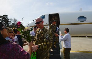 As the plane landed, excitement filled the air as family and friends gathered on the tarmac for the return of ten 76th Airlift Squadron members, one 86th Operations Support Squadron member, and four contract maintenance personnel on Ramstein Air Base, Germany, April 1, 2017.