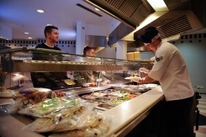 Airman 1st Class Samuel Abbott, 786th Force Support Squadron food service journeyman, serves Airmen during lunch at the Rheinland Dining Facility on Ramstein Air Base, Germany, Feb. 13, 2017. Last year, the 786th FSS supported more than 1,900 professional military education students and 1,200
