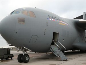 A C-17 sits on display in Riga, Latvia, where its capabilities were displayed Nov. 27 to NATO Secretary General Jaap de Hoop Scheffer, the president of Latvia, and senior alliance military officials - including Gen. Tom Hobbins, Allied Air Component Commander and U.S. Air Forces in Europe Commander.