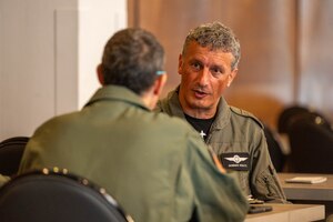 Retired Chief Master Sgt. of the Air Force Rodney J. McKinley and U.S. Air Force Chief Master Sgt. Clifford L. Lawton, 86th Airlift Wing command chief, meet with Airmen and visit different squadrons around the installation during an immersion at Ramstein Air Base, Germany, Sept. 19, 2025. McKinley