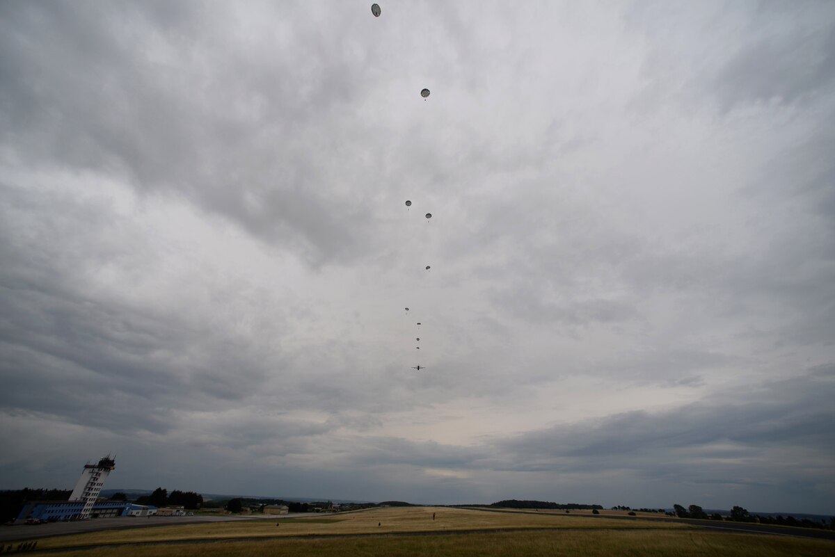 A C-130J Super Hercules assigned to the 37th Airlift Squadron, flies around after a drop at International Jump Week in Bitburg, Germany, July 11, 2017. The intended goal for International Jump Week is to get partner nations coordinated in techniques, parachutes, and other ways of dropping paratroopers. (U.S. Air Force photo by Airman 1st Class D. Blake Browning)