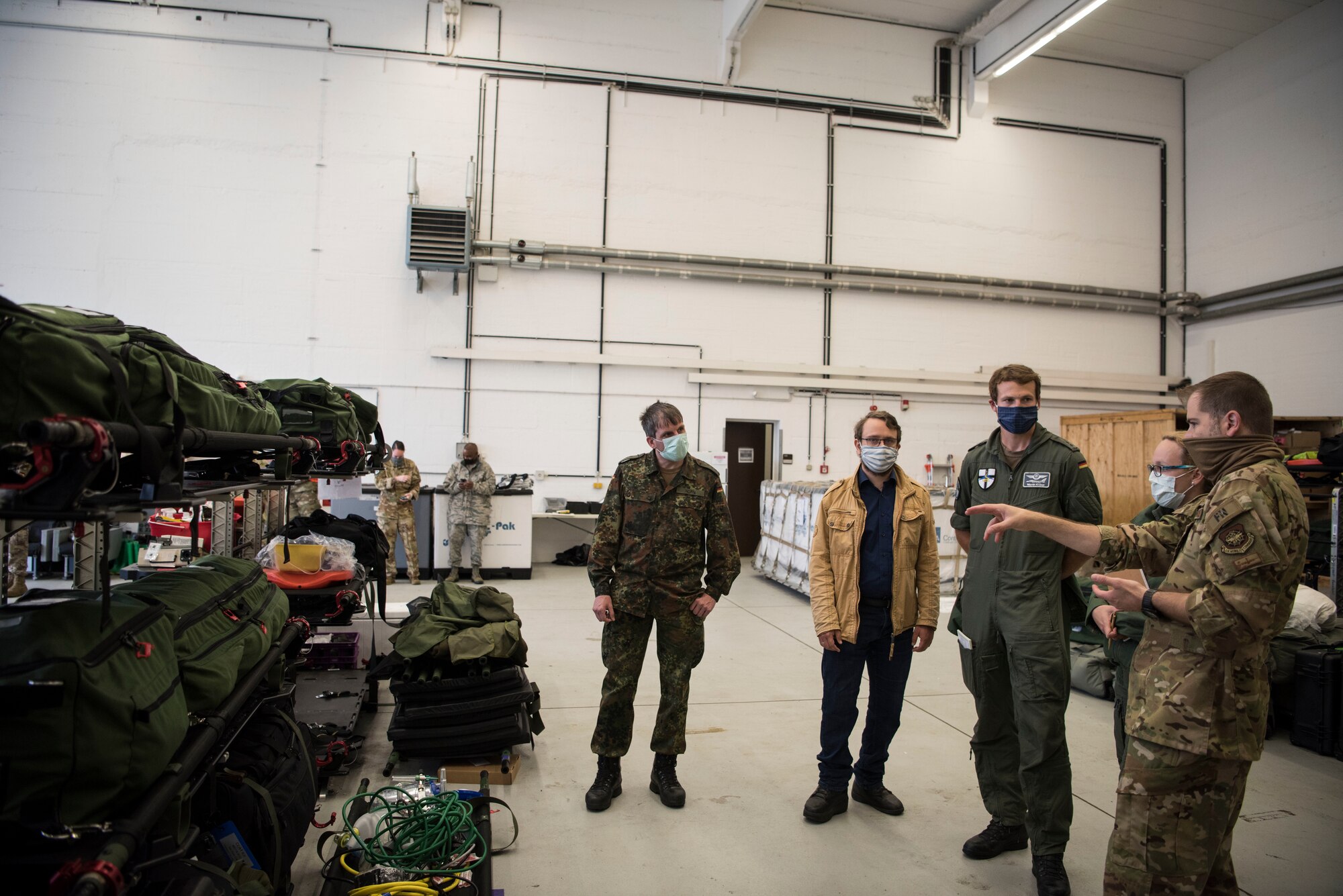 U.S. Air Force Maj. Sean Smith, 10th Expeditionary Aeromedical Evacuation Flight aeromedical evacuation operations team officer in charge, gives a briefing to medical professionals from the German air force’s center for aerospace medicine onboard a U.S. Air Force C-17 Globemaster III aircraft during a COVID-19 Transport Isolation System briefing at Ramstein Air Base, Germany, June 4, 2020. The German Air Force members toured the 10 EAEF facilities as well as an aircraft that held the TIS, in order to familiarize themselves with COVID-19 TIS procedures and equipment. The TIS is an infectious disease containment unit designed to minimize contamination risk to aircrew and medical attendants, while allowing in-flight medical care for patients afflicted by a disease like COVID-19. (U.S. Air Force photo by Senior Airman Milton Hamilton)