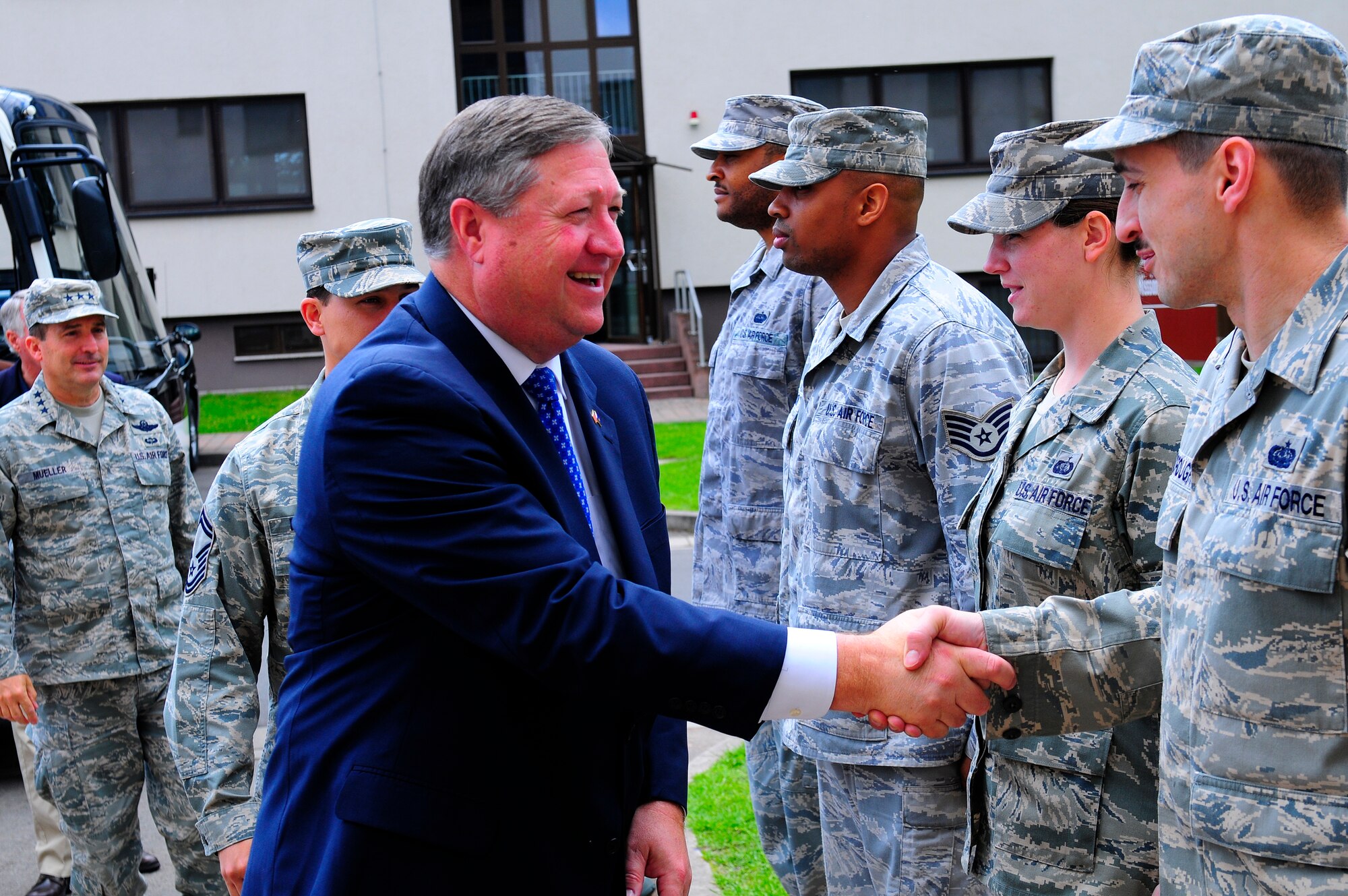 U.S. Air Force Capt. Daniel Helland, 76th Airlift Squadron, briefs Secretary of the Air Force Michael Donley on C-21 aircraft aeromedical evacuation procedures on Ramstein Air Base, Germany, June 18, 2011. The secretary traveled to Europe to meet with Airmen and receive updates from command leadership on U.S. Air Force Europe efforts to build partnership capacity and ongoing contingency support for Operation Unified Protector. (U.S. Air Force Photo by Airman 1st Class Brea Miller)