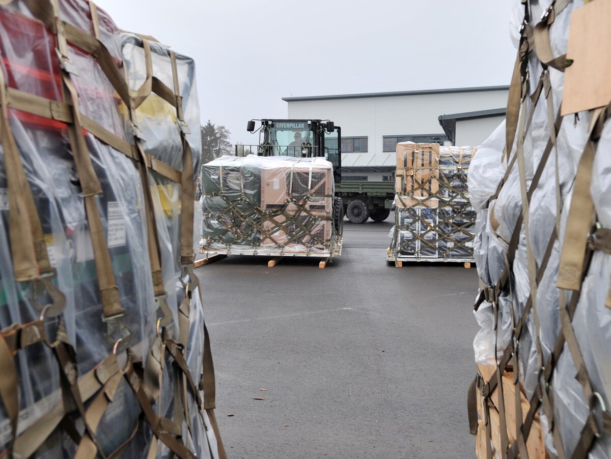 U.S. Air Force Senior Airman Justin Burger, 86th Logistics Readiness Squadron combat readiness technician, directs Airman 1st Class Philip Smouse, 86th LRS air transport, as he moves cargo during an in-check in support of Operation Unified Protector, Ramstein Air Base, Germany, April 1, 2011. Unified Protector is a NATO-led operation in Libya to protect civilians and civilian-populated areas under threat of attack. (U.S. Air Force photo by Senior Airman Caleb Pierce)