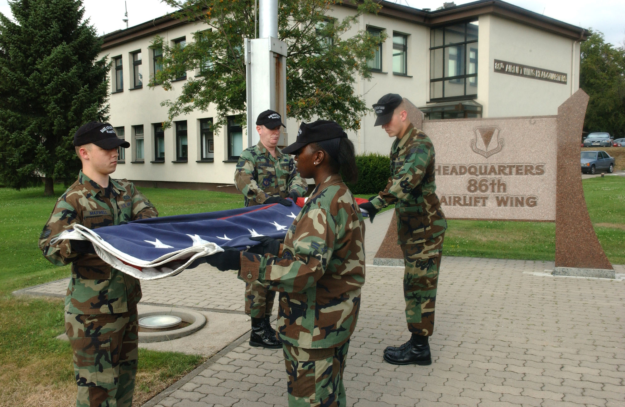 Airmen from Ramstein’s Honor Guard perform a retreat ceremony in front of the 86th Airlift Wing Headquarters building. The 86th Air and Space Communications Squadron will hold the next retreat at 4:30 p.m. Aug. 31 at Ramp 3, just across from the wing flagpoles.
