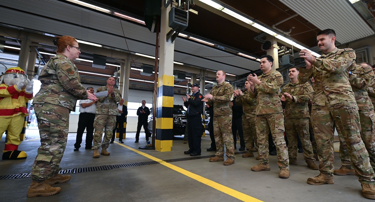 U.S. Air Force Brig. Gen. Adrienne Williams, 86th Airlift Wing commander, signs the Kaiserslautern Military Community Proclamation at Ramstein Air Base, Germany, Oct. 2, 2024. During the proclamation ceremony, U.S Air Force Lt. Col. Katherine M. Paulson, 86th Civil Engineer Squadron commander and fire marshal, proclaimed Williams as the honorary fire marshal, and as fire marshal, Williams has declared Oct. 5-19, as the 2024 fire prevention week. (U.S. Air Force photo by Senior Airman Edgar Grimaldo)