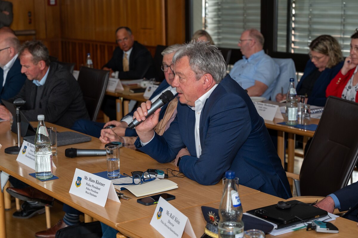 U.S. Air Force Maj. Gen. Paul Moga, Third Air Force commander, and Ralf Lessmeister, Kaiserslautern County Commissioner, pose for a photo during the 2025 annual Mayors’ Forum at Kaiserslautern, Germany, May 5, 2025. These events reinforce the shared commitment to safety, economic stability, and community well-being across both U.S. and German community members. (U.S. Air Force photo by Airman 1st Class Dylan Myers)