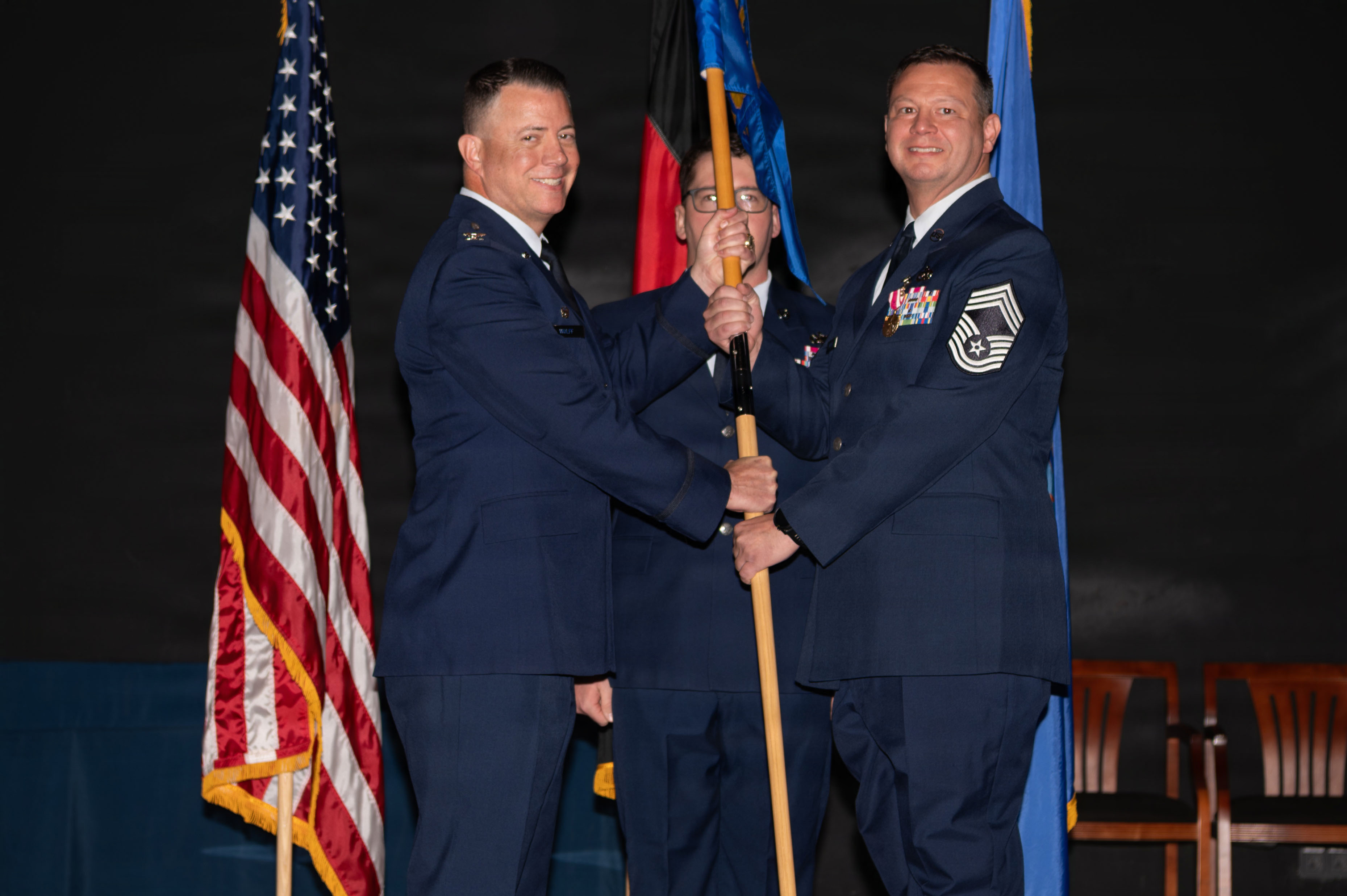 U.S. Air Force Chief Master Sgt. Davisha Ware, 86th logistics readiness group incoming senior enlisted leader, assumes responsibility of the 86 LRG from Col. Jason Wolff, 86th LRG commander, during a Change of Responsibility ceremony at Ramstein Air Base, Germany, Oct. 9, 2025. The 86th LRG is composed of four squadrons and provides training, planning, supply and transportation ensuring wing readiness. (U.S. Air Force photos by Airman 1st Class Jason Jones Jr.)