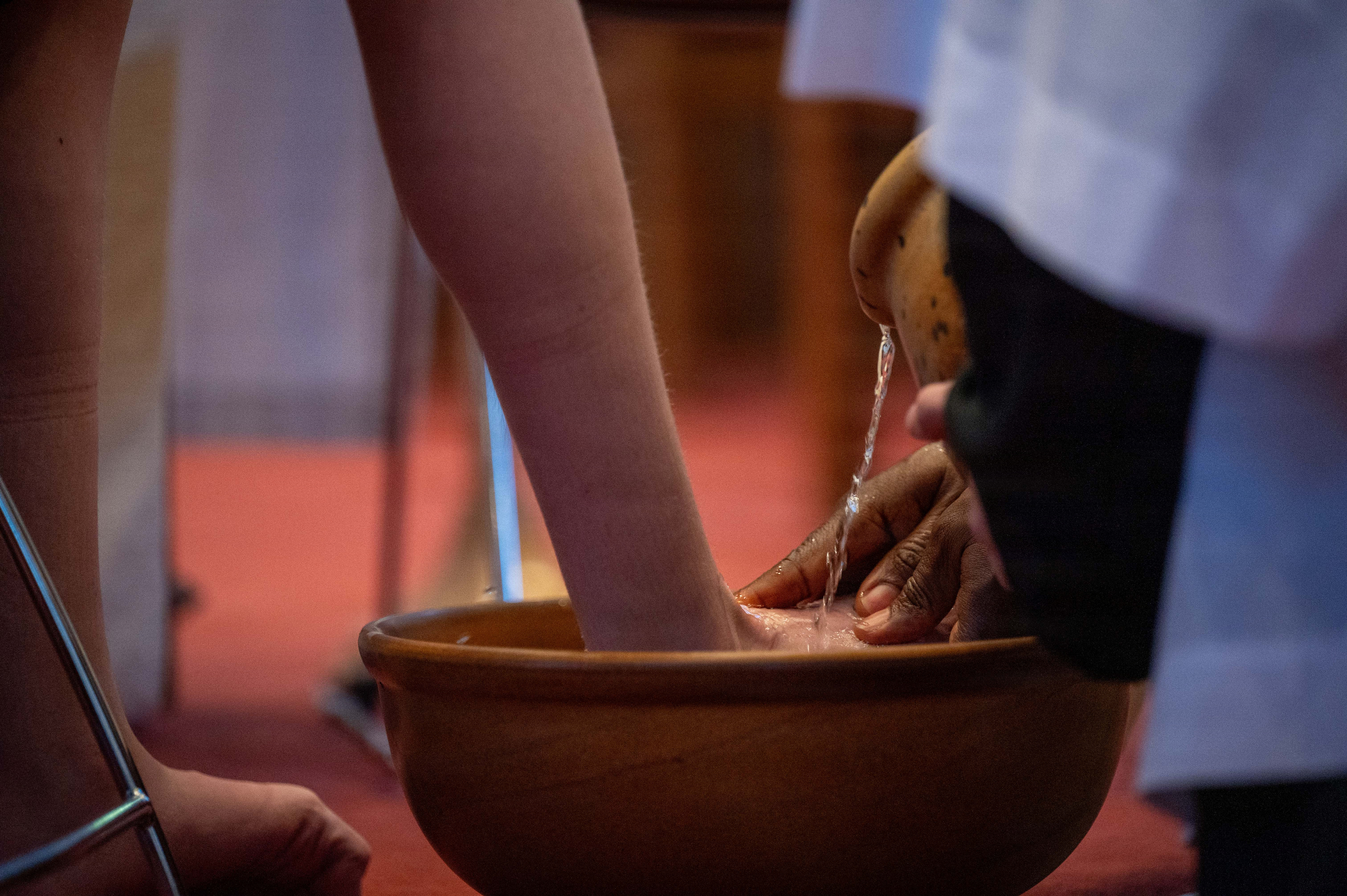 U.S. Air Force Maj. Nelson O. Ogwuegbu, 86th Airlift Wing senior priest, washes the feet of a church attendee during a Holy Thursday mass at the Northside Chapel on Ramstein Air Base, Germany, April 2, 2026. Through services like these, chaplains help foster unity, resilience and spiritual well-being across the Kaiserslautern Military Community. (U.S. Air Force photo by Senior Airman Dylan Myers)