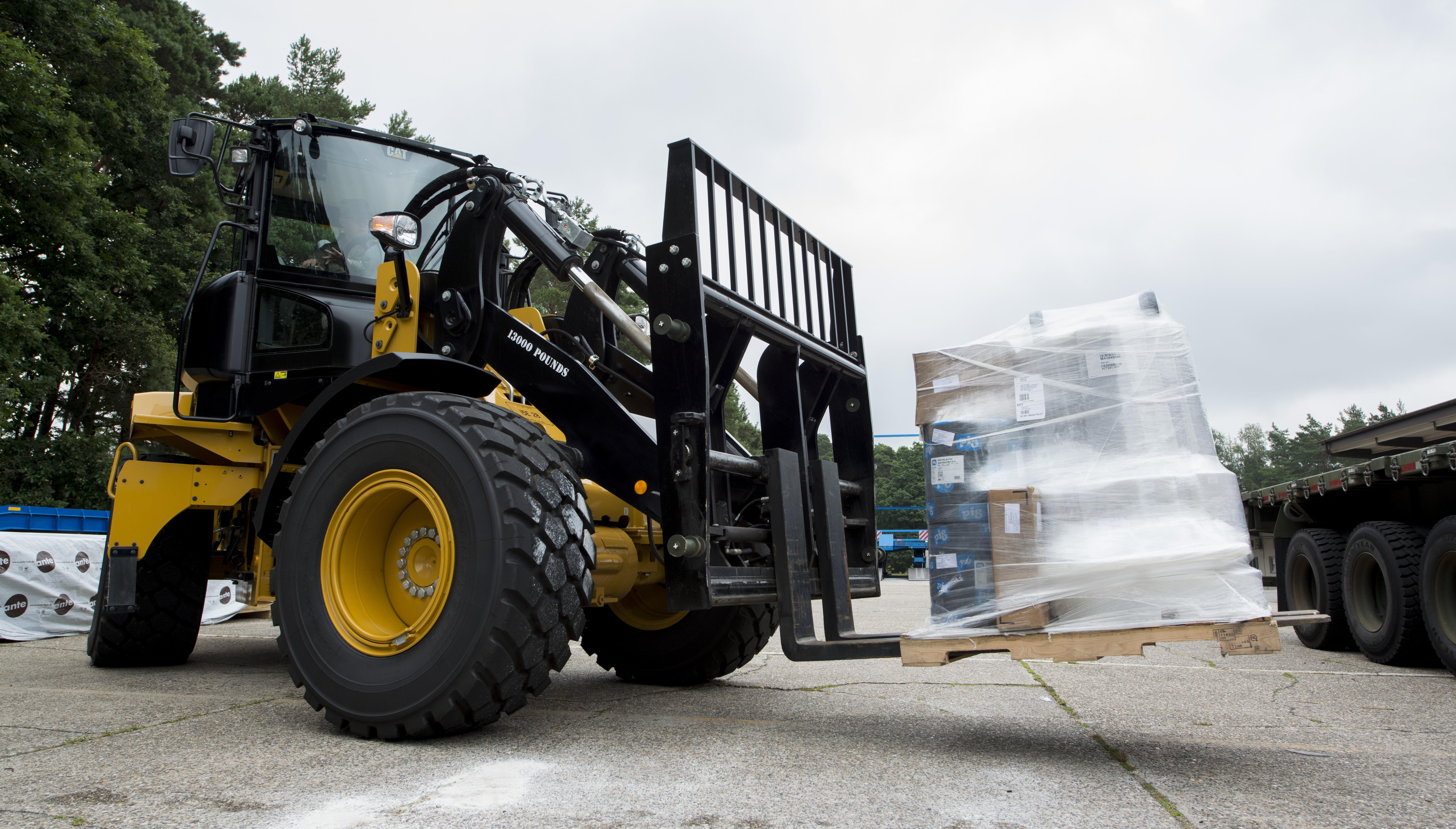 From left, Airman 1st Class Brody Ellyson and Senior Airman Joseph Clayson, 86th Vehicle Readiness Squadron vehicle operators, tie ratchet straps over cargo pallets Aug. 19, 2016 at Ramstein Air Base, Germany. It’s the responsibility of vehicle operators to transport people, supplies, munitions and outsized expeditionary forces. (U.S. Air Force photo/Senior Airman Tryphena Mayhugh)