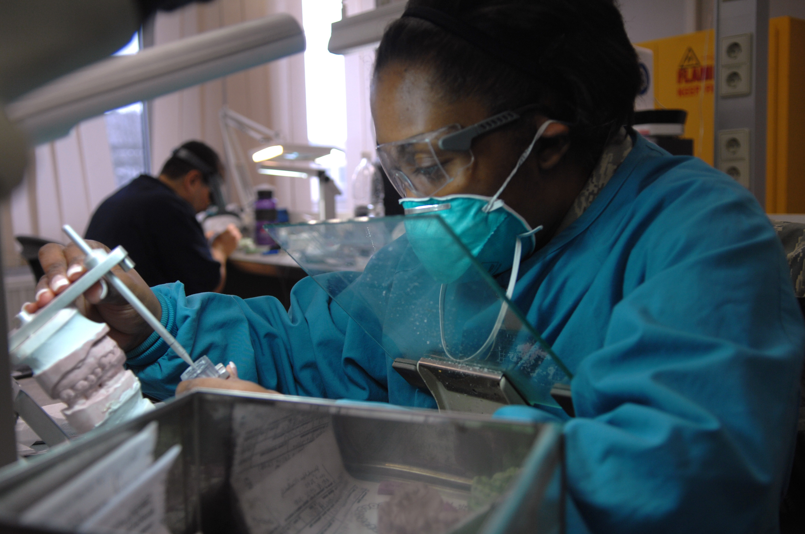 Senior Airman Lakresha Walston a dental laboratory technician from Greenville, N.C., forms a night-guard, 22 Feb. at the Sembach Area Dental Laboratory, Sembach Annex, Germany. Sembach ADL personnel who work at Building 151 on Sembach Annex will accept control of their new facility Building 301A behind the dental clinic located on Ramstein Air Base, Germany. (U.S. Air Force photo by Tech. Sgt. Michael Voss)