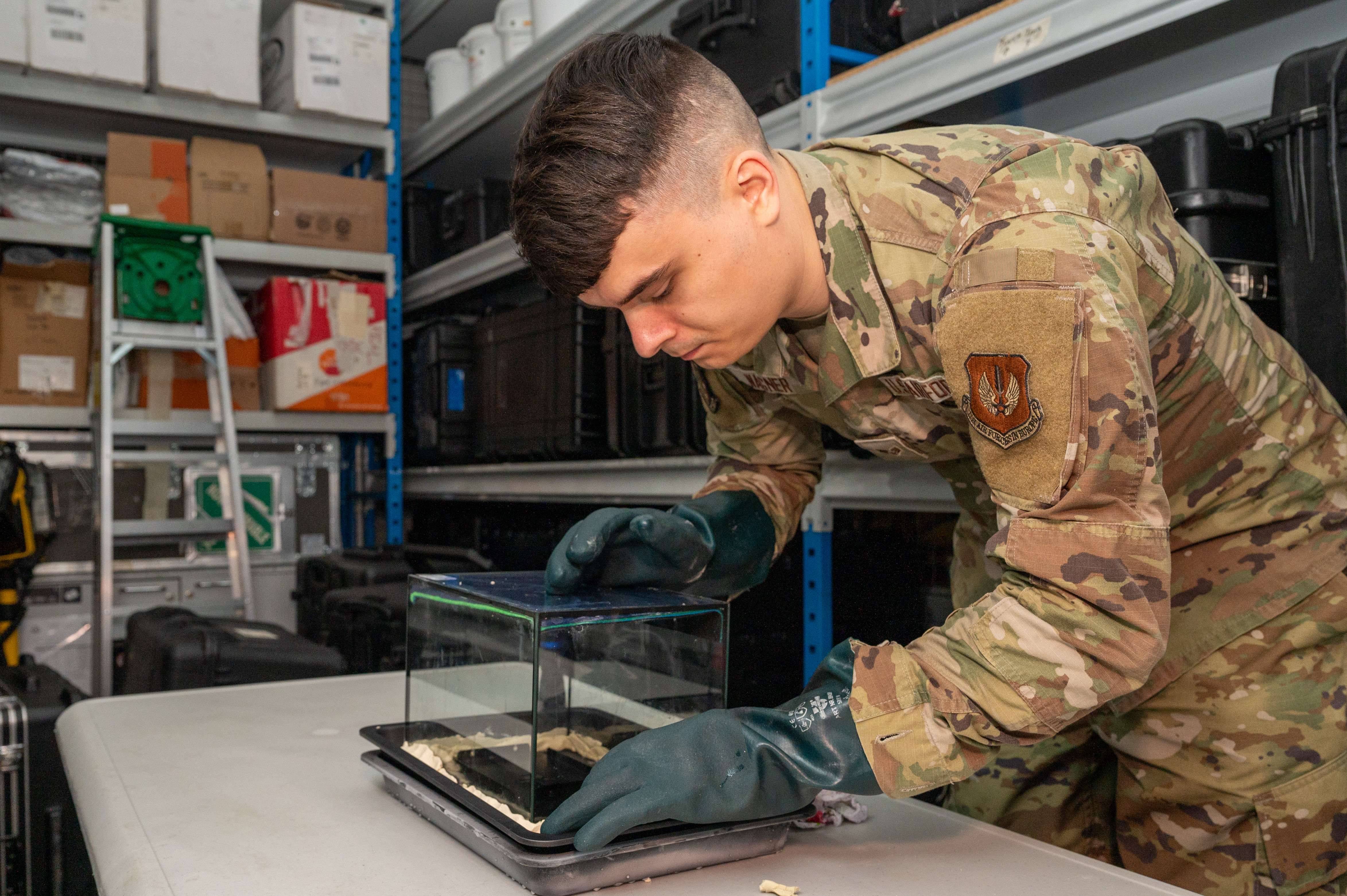 U.S. Air Force Brig. Gen. Adrienne L. Williams (left), 86th Airlift Wing commander, and Chief Master Sgt. Clifford L. Lawton (right), 86th Airlift Wing command chief, present Tech. Sgt. Charles Hayward, 86th Aeromedical Evacuation Squadron clinical simulator element noncommissioned officer in charge, with the stripe of his promotion under the Air Force’s Stripes for Exceptional Performers program, Nov. 25, 2025, at Ramstein Air Base, Germany. Every year, a limited number of top-performing Airmen are promoted through the program. (U.S. Air Force photo by Airman Paden Henry)