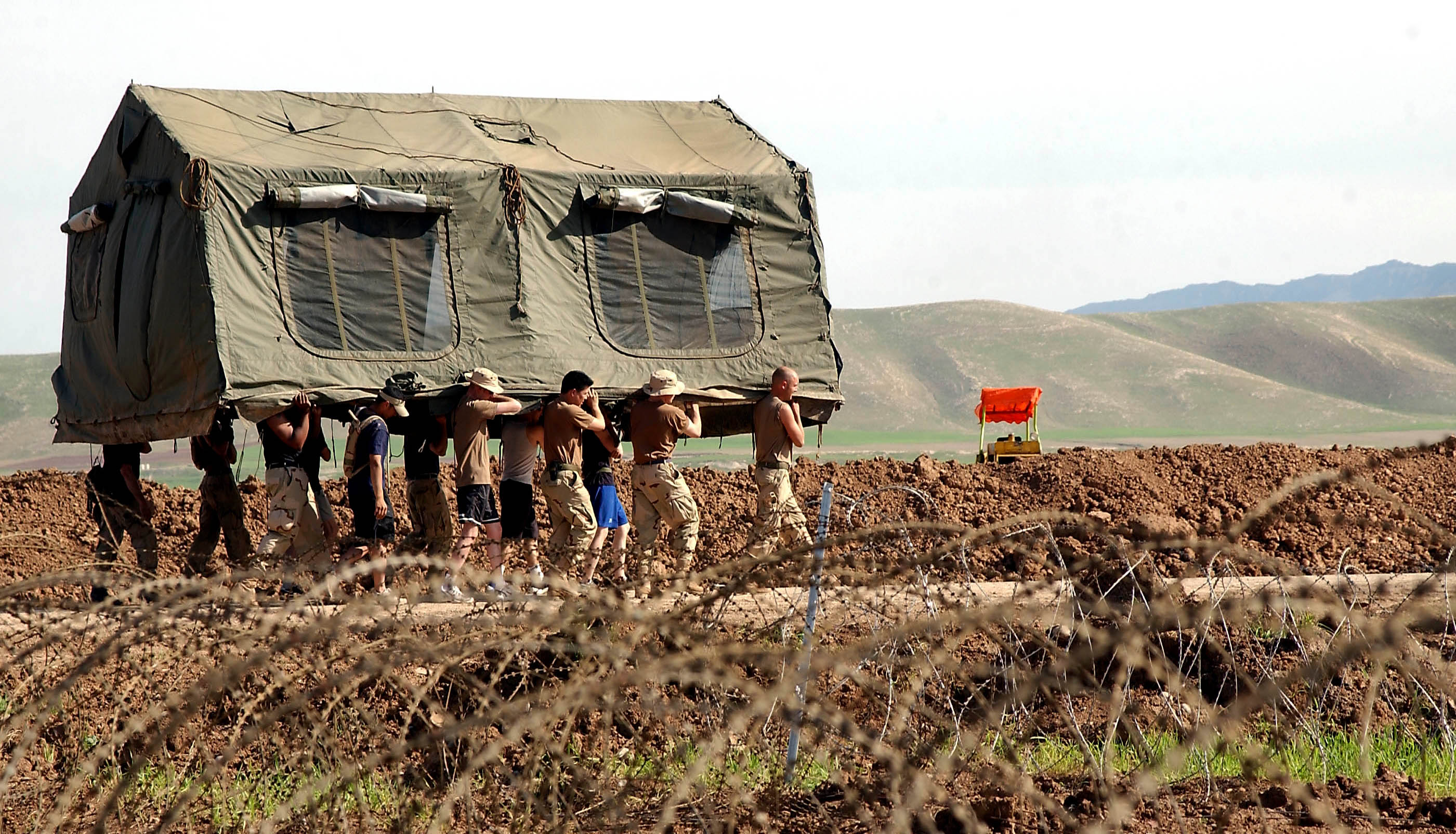 OPERATION IRAQI FREEDOM -- Airmen of the 786th Security Forces Squadron move their tent to a new spot at Bashur Airfield, Iraq. The 86th Expeditionary Contingency Response Group set up camp around the airfield when it landed there March 26. The group's mission is to land at a bare base and set up airfield operations. U.S. Air Force photo by Master Sgt. Keith Reed)