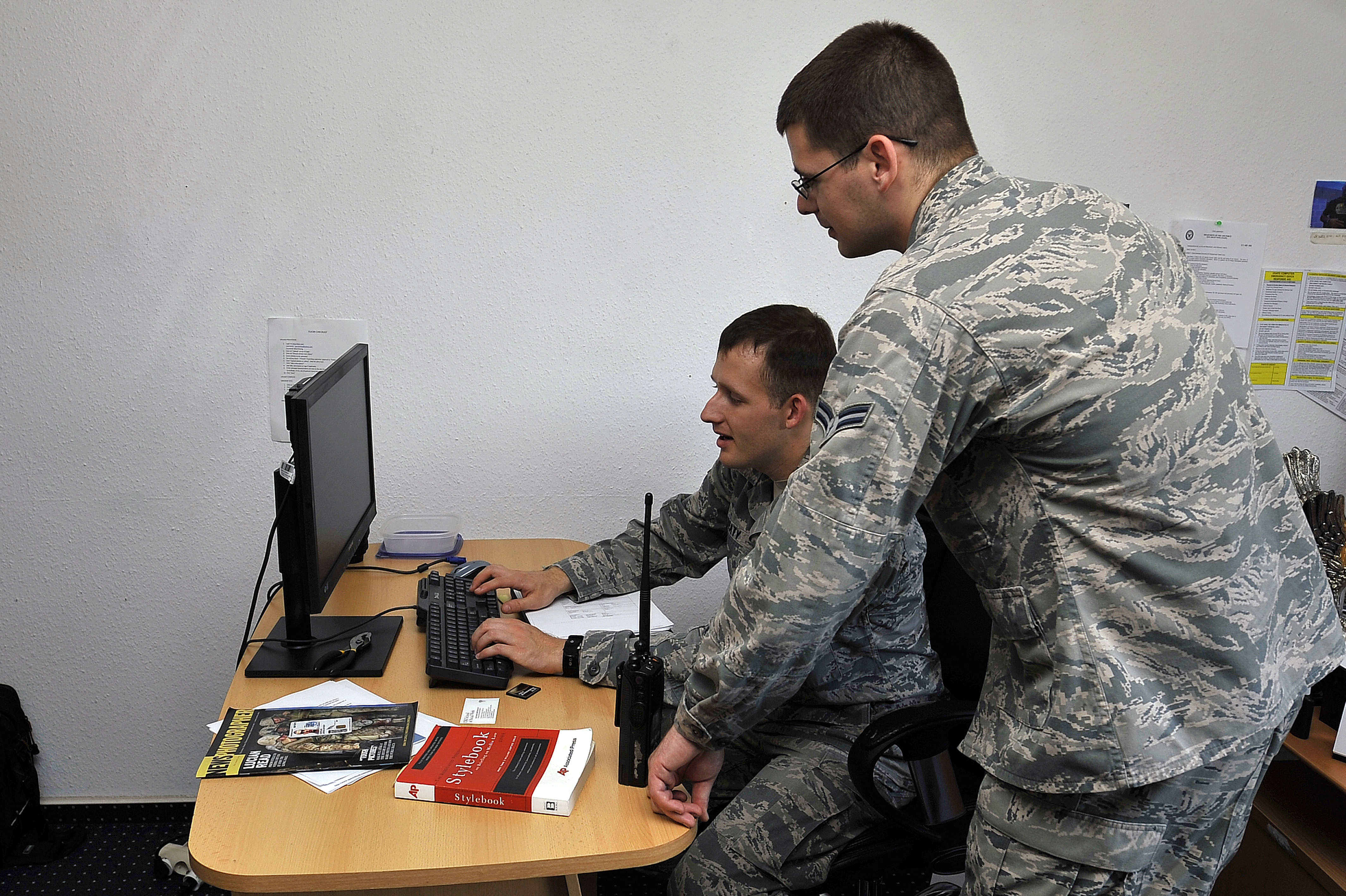 Airmen 1st Class Brandon Beaty (left) and Todd Caldwell, 86th Communication Squadron client system technicians, map a computer to the network, June 17, 2013, Ramstein Air Base, Germany. Client system technicians sustain, troubleshoot and repair standard, data and video network devices. (U.S. Air Force photo/Airman 1st Class Trevor Rhynes)