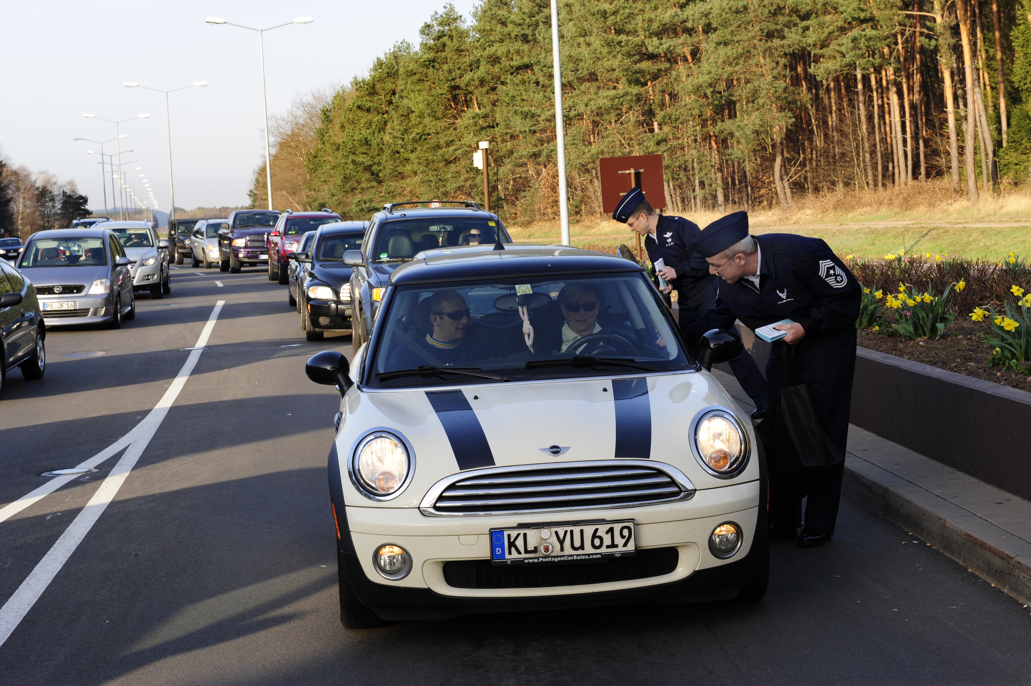 Brig. Gen. C.K. Hyde, 86 Airlift Wing, commander, and Chief Master Sgt. James Morris, 86 Airlift Wing, command chief, hand out flyers at the west gate in recognition of Sexual Assault Awareness Month, Ramstein Air Base, Germany, April 2, 2012. The wing has several programs that include Sexual Response Coordinators and Victim Advocates to assist in the prevention of sexual assault. Advocates are aligned throughout the wing to help victims and survivors. (U.S. Air Force photo by Senior Airman Aaron-Forrest Wainwright)
