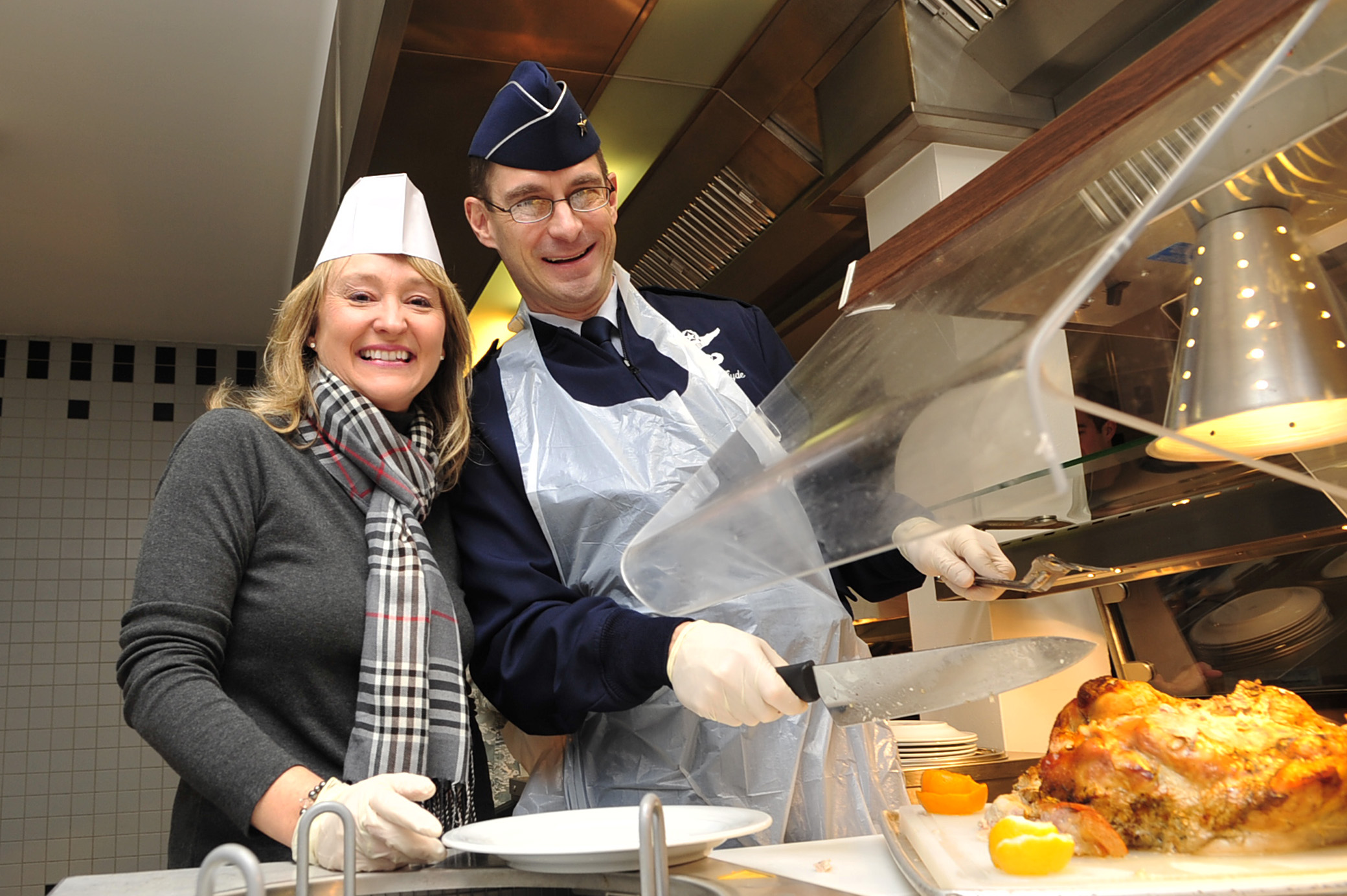 Brig Gen. C. K. Hyde carves a turkey as Mrs. Jodie Hyde prepares to serve Airman and family members during the Thanksgiving dinner service at the Rheinland-Inn Dining Facility, 24 Nov, 2011, Ramstein Air Base, Germany. The dining facility host Thanksgiving dinner annually to ensure every Airman has a place to go for a thanksgiving meal. (U. S. Air Force photo by Staff Sgt. Tyrona Lawson)