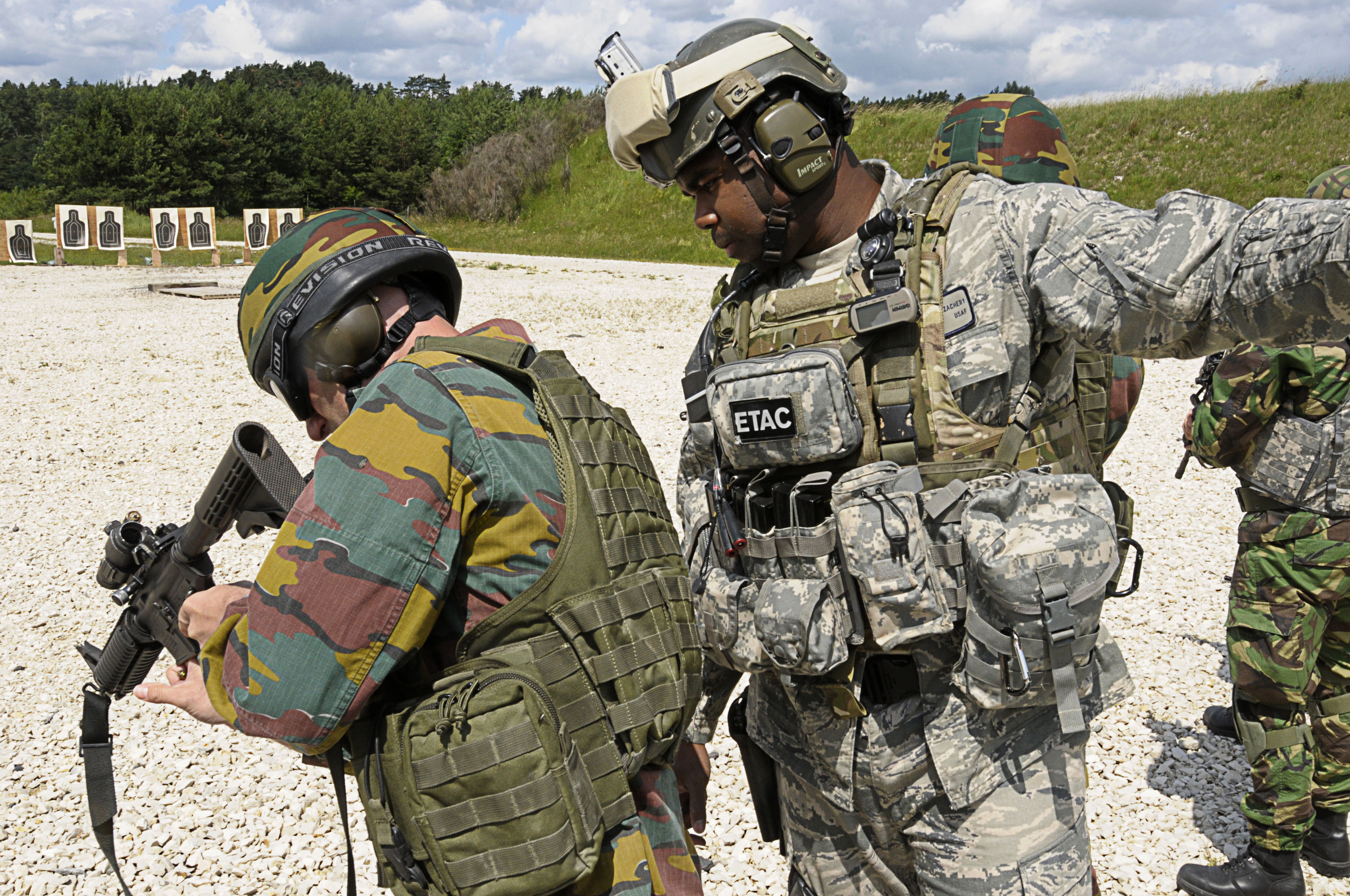 U.S. Air Force Master Sgt. Robert Zachary, 4th Air Support Operations Group, assists NATO armed forces personnel during weapons familiarization training at Allied Strike, held at Grafenwoehr Training Area, Germany, June 24, 2011. Allied Strike is Europe’s premier Close Air Support exercise, held annually to conduct robust, realistic CAS training that helps build partnership capacity among Allied NATO nations and refine the latest operational CAS tactics. (U.S. Air Force photo by Airman 1st Class Desiree W. Esposito)