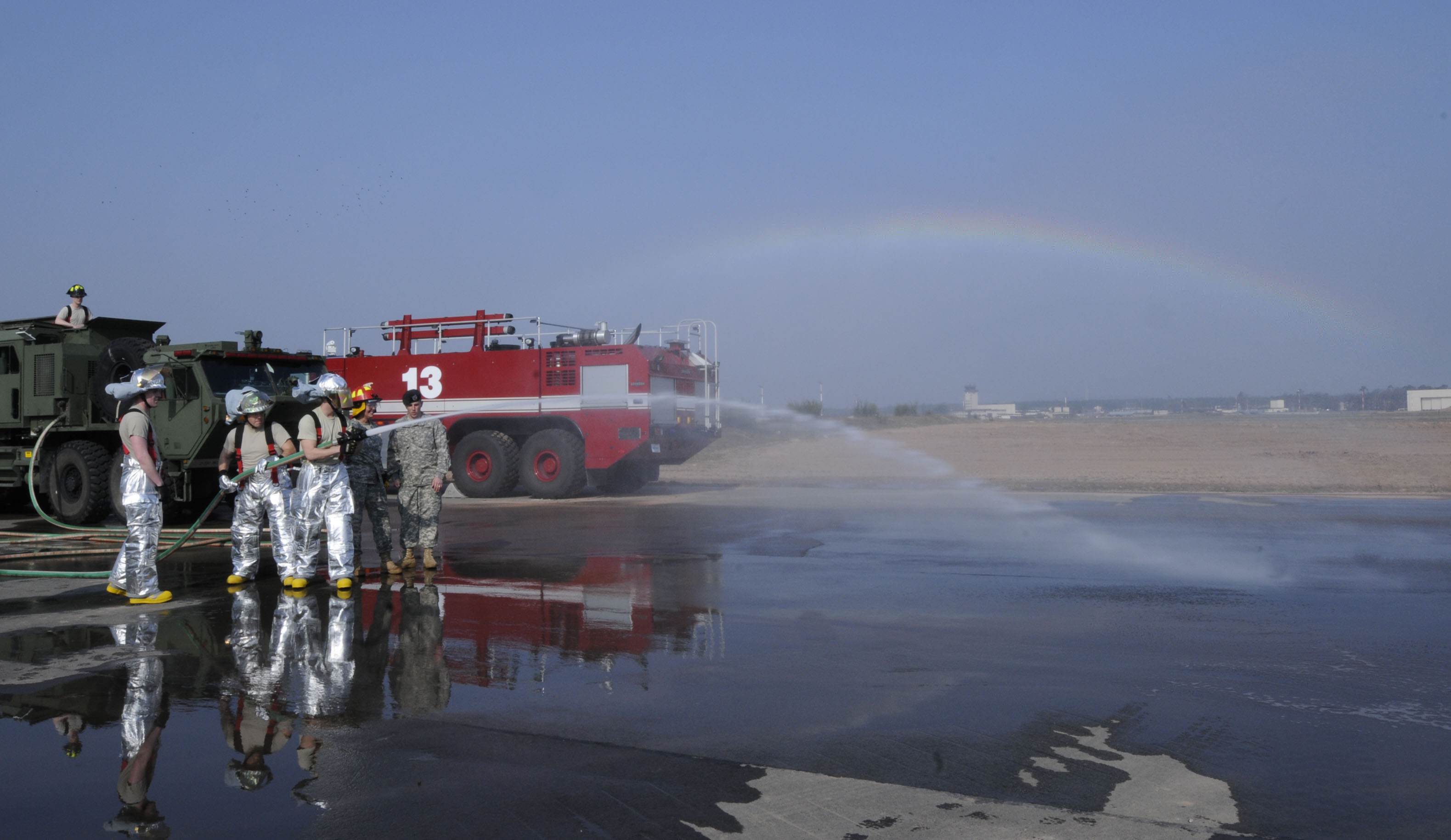 U.S. Army Maj. Gen. Patricia McQuistion, 21st Theater Sustainment Command commander, observes a fire hose demonstration by members of the 23rd Ordinance Company from U.S. Army Garrison Grafenwoehr, Ramstein Air Base, Germany, March 23, 2011. The exercise included U.S. Airmen from Ramstein and Soldiers from Grafenwoehr and was used to build a partnership between the two services in preparation for future deployments. (U.S. Air Force photo by Airman Kendra Alba)
