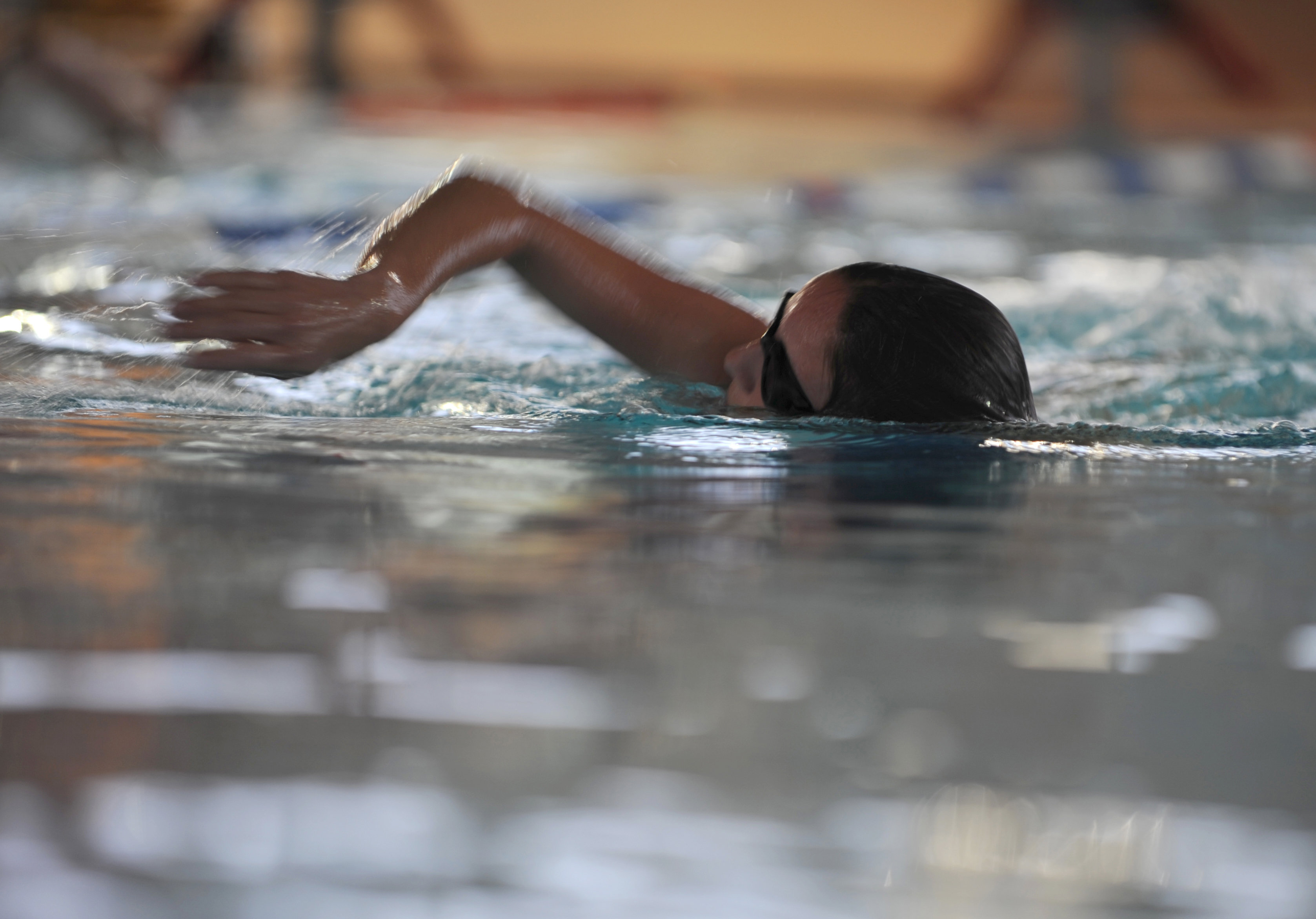 A member from the 3rd Air Force competes in a 200 meter swim event at the base aquatic center as part of their unit's sports day, Ramstein Air Base, Germany, Aug. 12, 2010. The unit's sports day was designed to encourage physical fitness, unit morale and family involvement. (U.S. Air Force photo by Senior Airman Caleb Pierce)