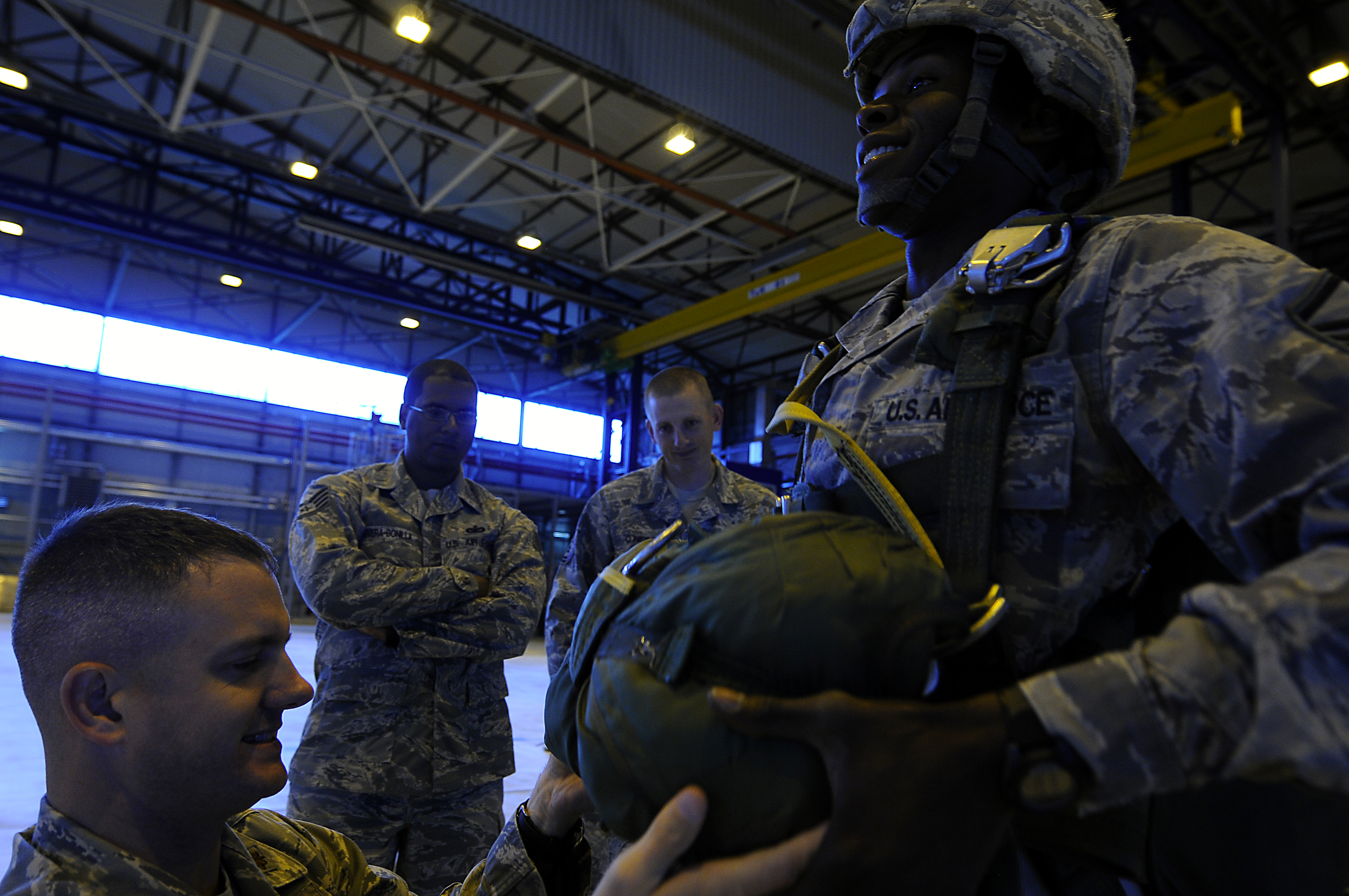 U.S. Air Force Master Sgt. Tyrone Morgan, 435th Security Forces Squadron operations superintendent, undergoes a jump master's personal inspection before a static line jump, Ramstein Air Base, Germany, Aug. 5, 2010. The combined U.S. forces airborne jump was conducted to maintain proficiency and to keep esprit de corps among paratroopers. (U.S. Air Force photo by Airman 1st Class Brea Miller)