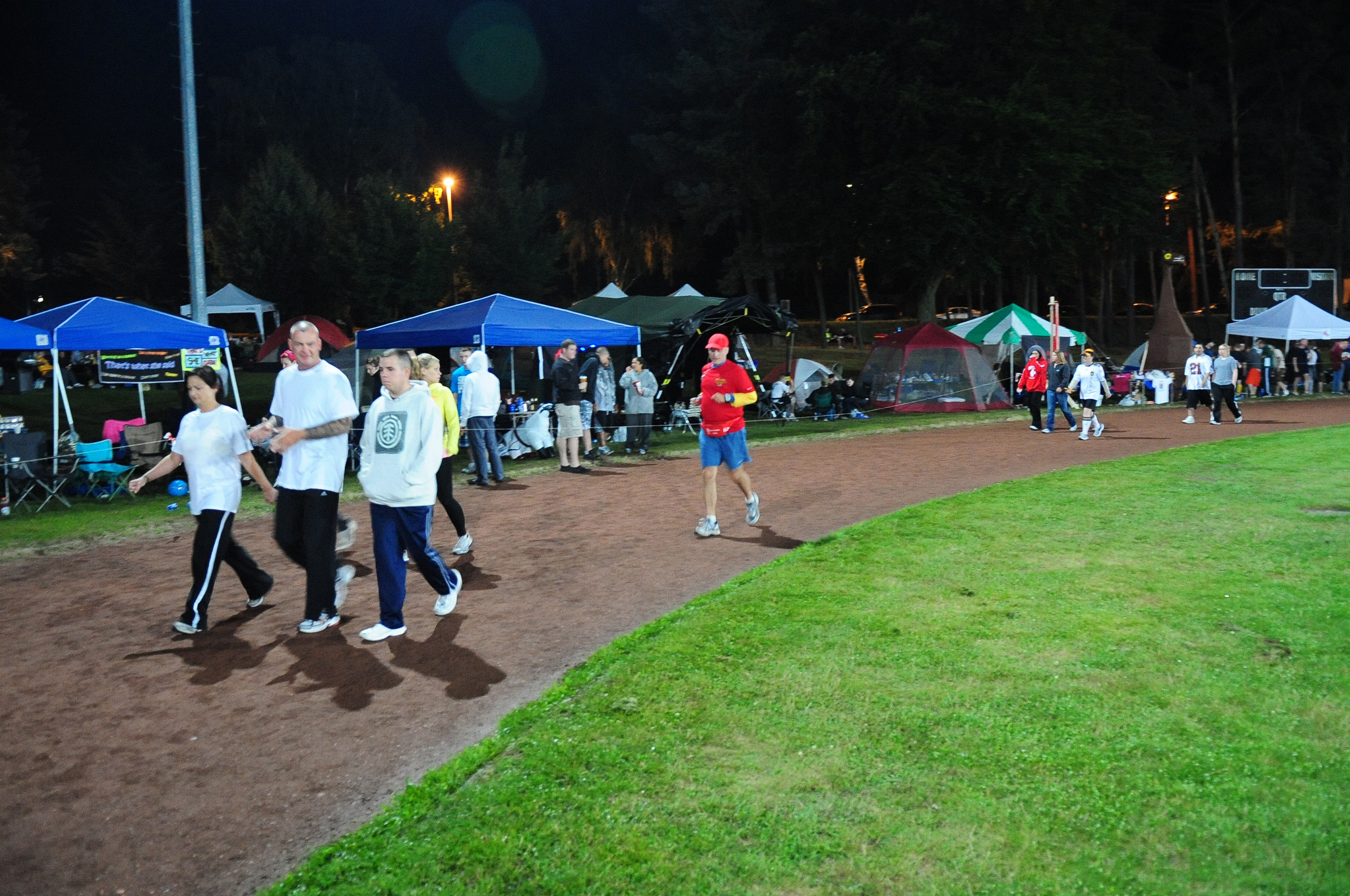 Participants walk around the track on Vogelweh Military Complex during the 2010 KMC Viking Challenge 30 July 2010. More than 75 teams of eight to eleven members took part in the 24 hour event held to raise money for the two Fisher Houses located by the Landstuhl Regional Medical Center and organizations throughout the Kaiserslautern Military Community. (U.S. Air Force Photo by Staff Sgt. Jocelyn Rich)