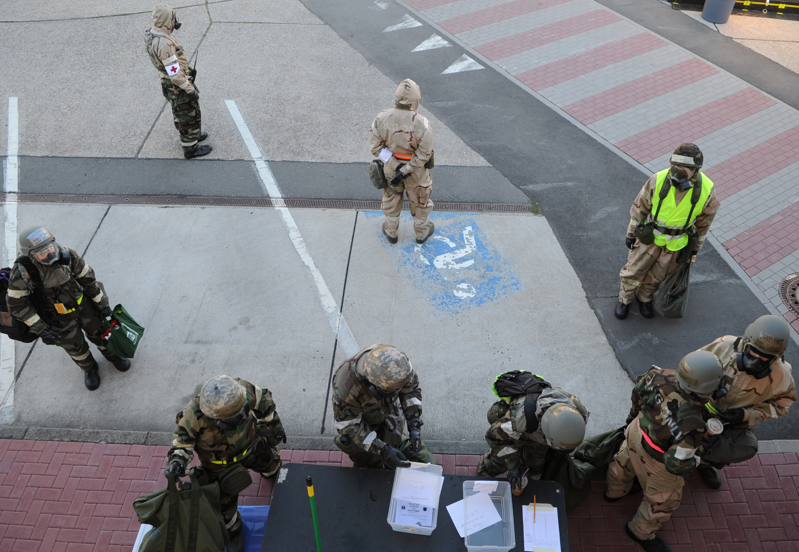 Members from the 86th Medical Group go through a decontamination checkpoint during an operational readiness exercise (ORE), Ramstein Air Base, Germany, July 18, 2010. An ORE incorporates a series of scenarios to evaluate a base's ability to execute operational duties under simulated wartime conditions. (U.S. Air Force Photo by Senior Airman Caleb Pierce)