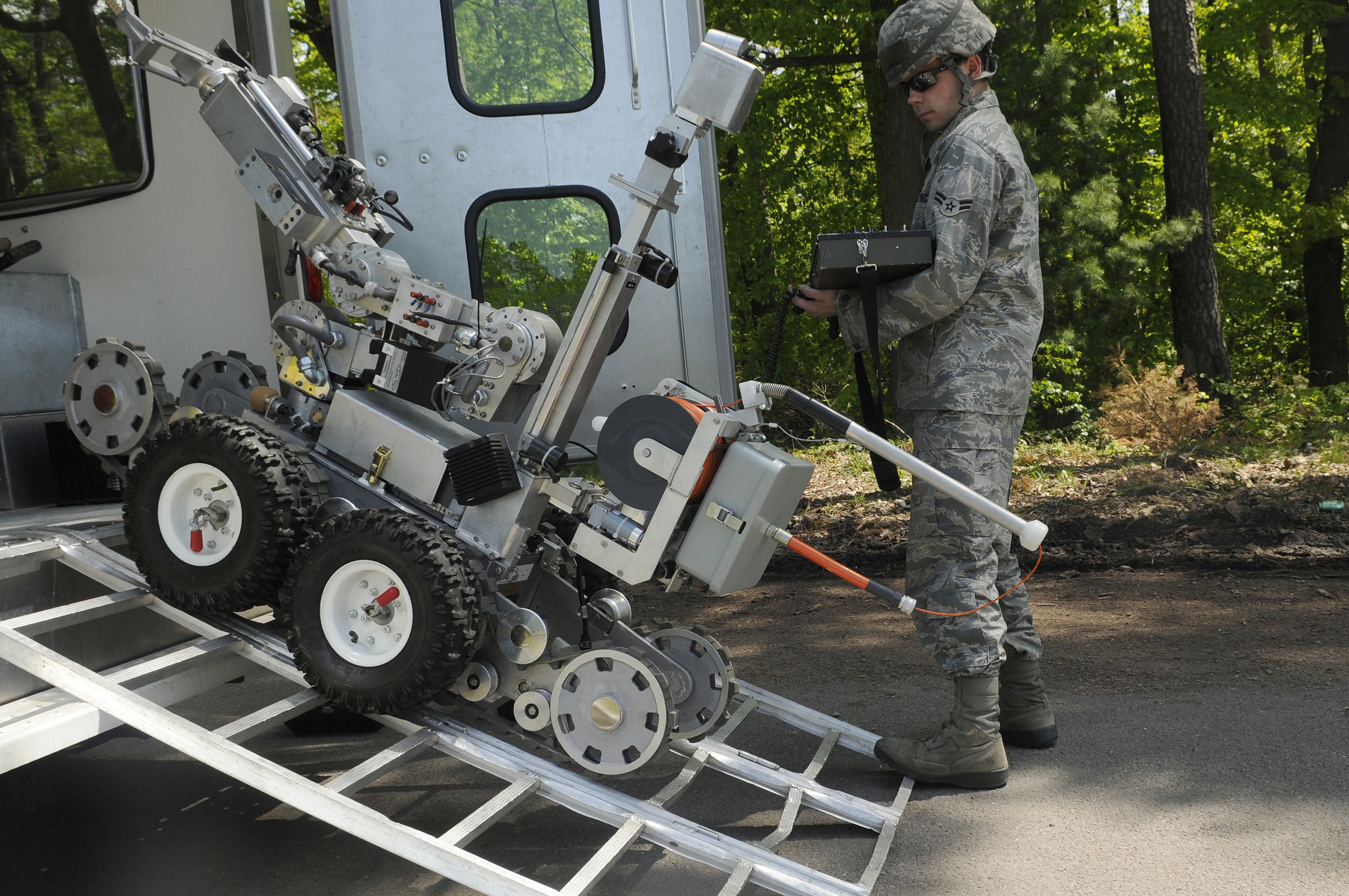 U.S. Air Force Airman 1st Class Michael Poffenberger, 886th Civil Engineering Squadron explosive ordnance disposal apprentice, operates a Remotec F6A robot during an Operational Readiness Exercise, Ramstein Air Base, Germany, May 22, 2010. The wing conducts Operational Readiness Exercises to evaluate mission readiness and the ability to survive and operate in a chemical environment. (U.S. Air Force photo by Airman 1st Class Desiree Esposito)