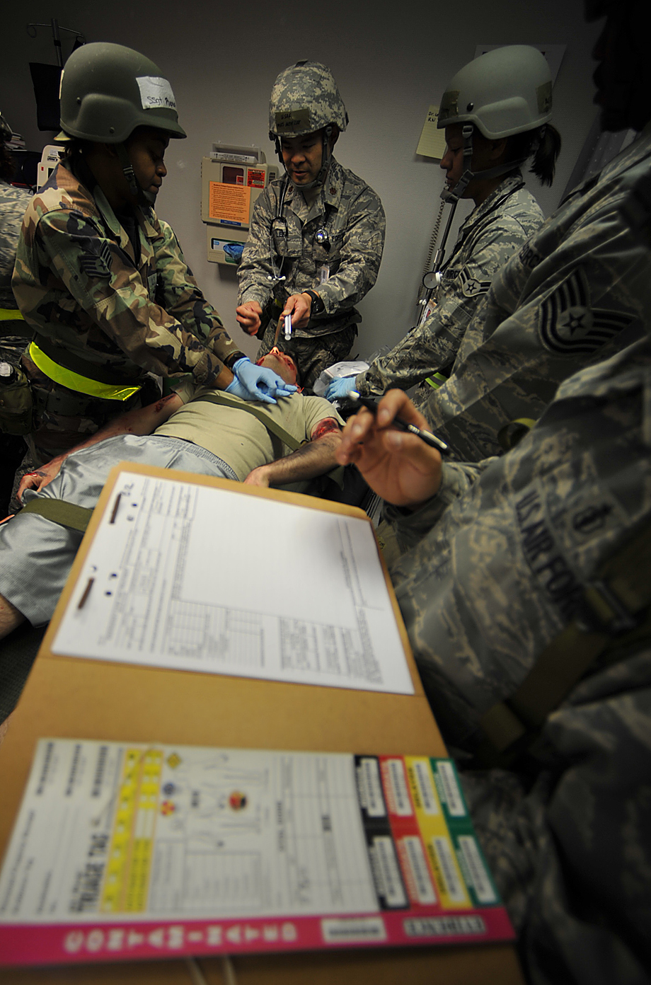 The 'triage team', consisting of various members from the 86th Medical Group, provide immediate medical care to a victim of a simulated rocket attack during an operational readiness exercise, Ramstein Air Base, Germany, May 22, 2010. The exercise is being conducted to prepare for an up-coming operational readiness inspection. (U.S. Air Force photo by Senior Airmen Tony R. Ritter)