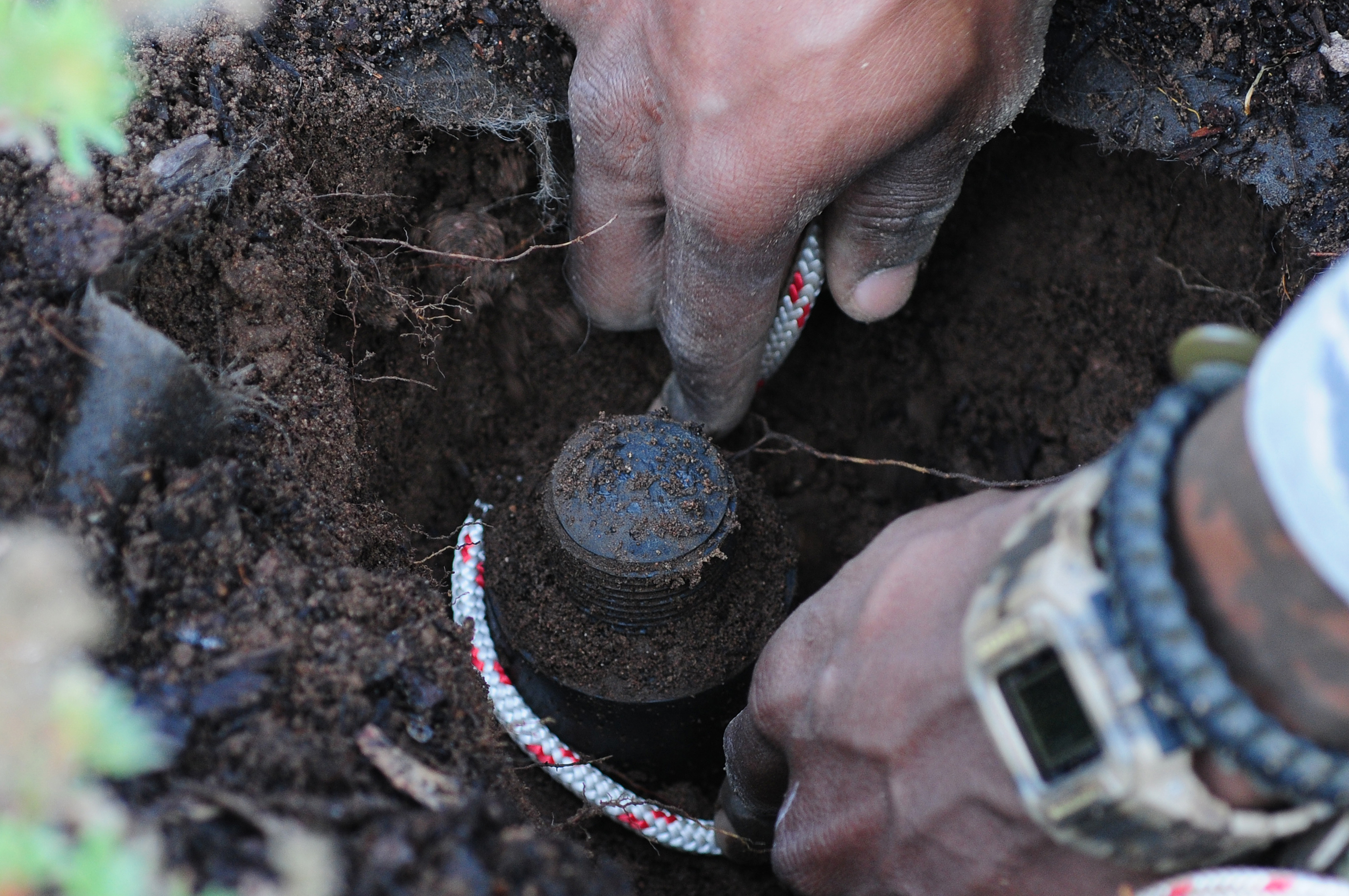 U.S. Air Force Staff Sgt. Wayne Howell, 886th Civil Engineering Squadron explosive ordnance disposal journeyman, ties a rope around a simulated rocket for a remote move procedure during an Operational Readiness Exercise (ORE), Ramstein Air Base, Germany, May 22, 2010. The wing conducts OREs to evaluate mission readiness and the ability to survive and operate in a chemical environment. (U.S. Air Force photo by Airman 1st Class Desiree Esposito)