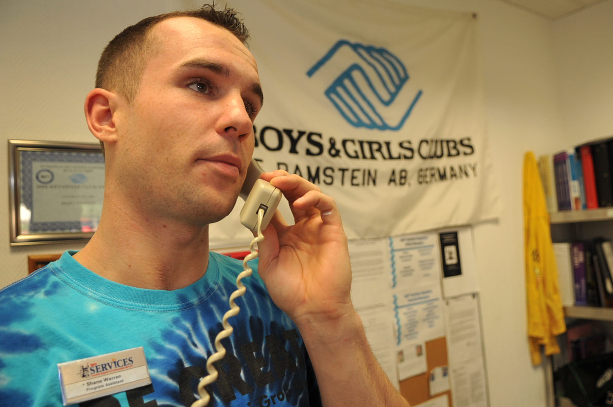 Shane Warren, program assistant, 86th Services Youth Programs, talks on the phone with a parent at The Teen Center, Ramstein Air Base, Germany, March 23, 2010. The Ramstein Teen Center is located in building 411 and is a safe, supervised enviroment for teens to hang out after school and in the evenings. (U.S. Air Force photo by Senior Airman Tony R. Ritter)