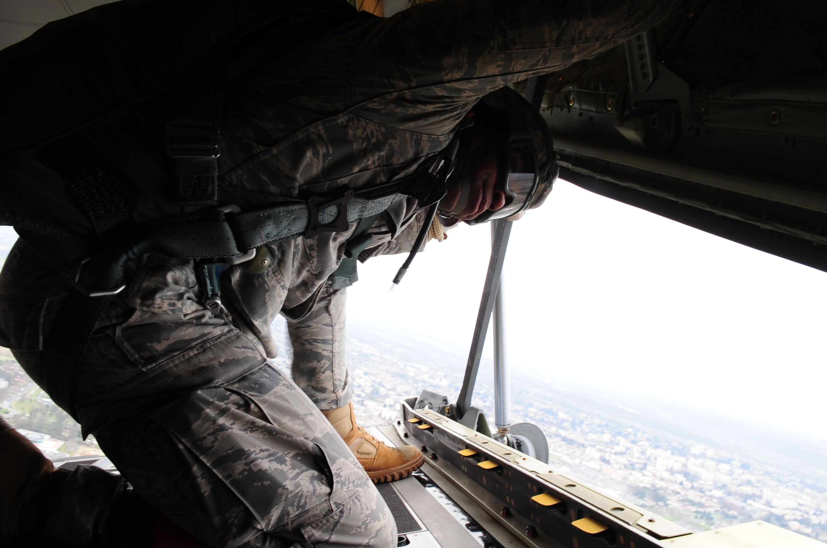 U.S. Air Force Master Sgt. James Turner from the 435th Security Forces Squadron, looks out the back of a C-130J as he prepares to lead his "stick" to include U.S. and French military members in a jump on March 3, 2010. Members of the 435th Contingency Response Group and the 5th Quartermaster Company joined with their French military counterparts for a week of training at the École des troupes aéroportées (ETAP), or School of Airborne Troops, a military school dedicated to training the military paratroopers of the French army, located in the town of Pau, in the département of Pyrénées-Atlantiques, France. The ETAP is responsible for training paratroopers, and for international cooperation and promotion of paratroop culture. (U.S. Air Force Photo by Staff Sgt. Jocelyn Rich)