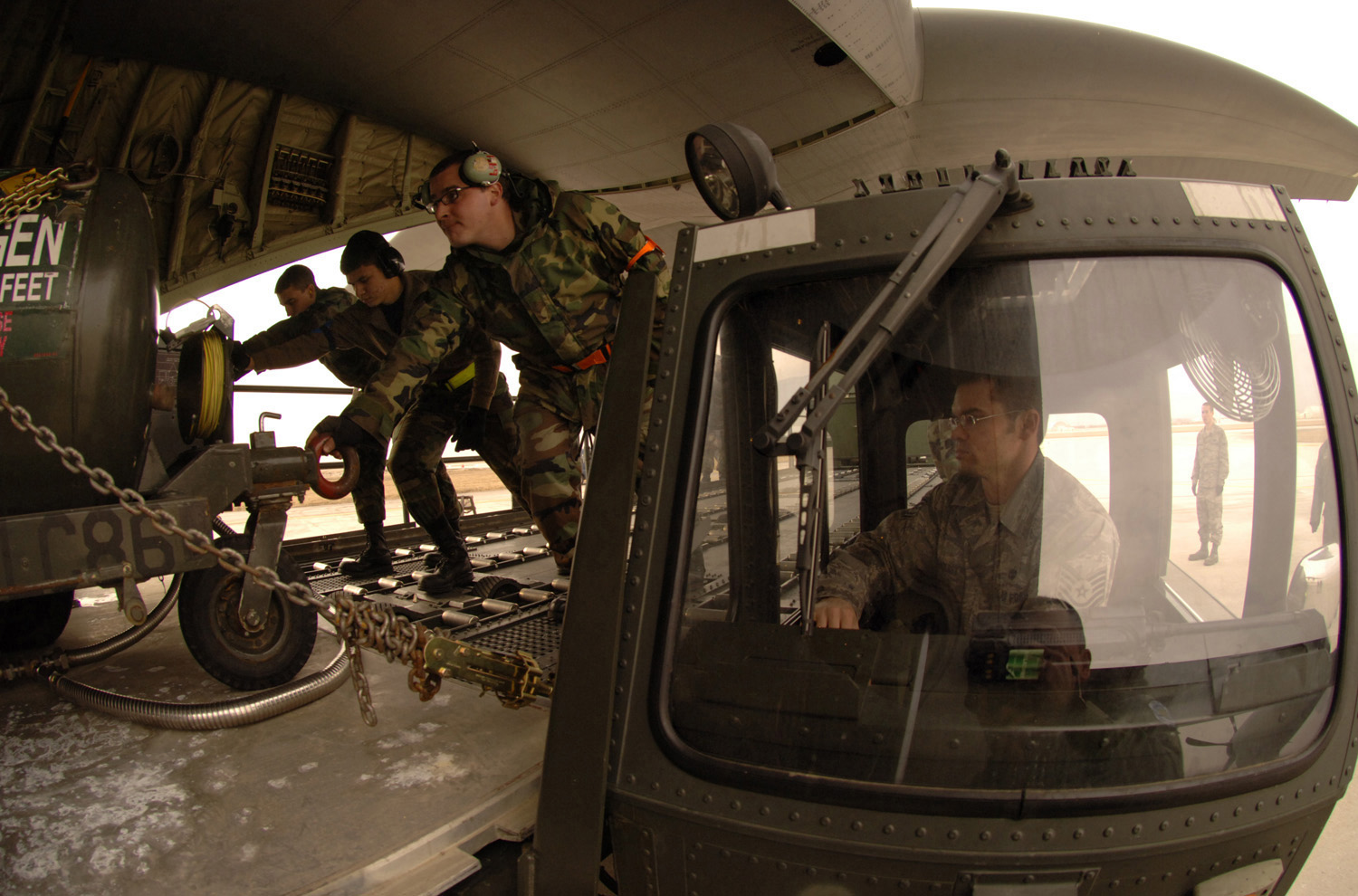 Aerial Porter Tech. Sgt. Anthony Malmquist assists Rhode Island Air National Guard Crew Chief Senior Airman Tom Reilly (2nd from right) in loading 25,000 pounds of cargo aboard a C-130J at Aviano Air Base, Italy, bound for Zaragoza Air Base, Spain, Jan. 9. The cargo, flown by the 38th Airlift Squadron from Ramstein, will support more than a dozen F-16 Falcon fighters and their dedicated support team conducting training in Spain for the next month. Photo by Master Sgt. Scott Wagers / (released)