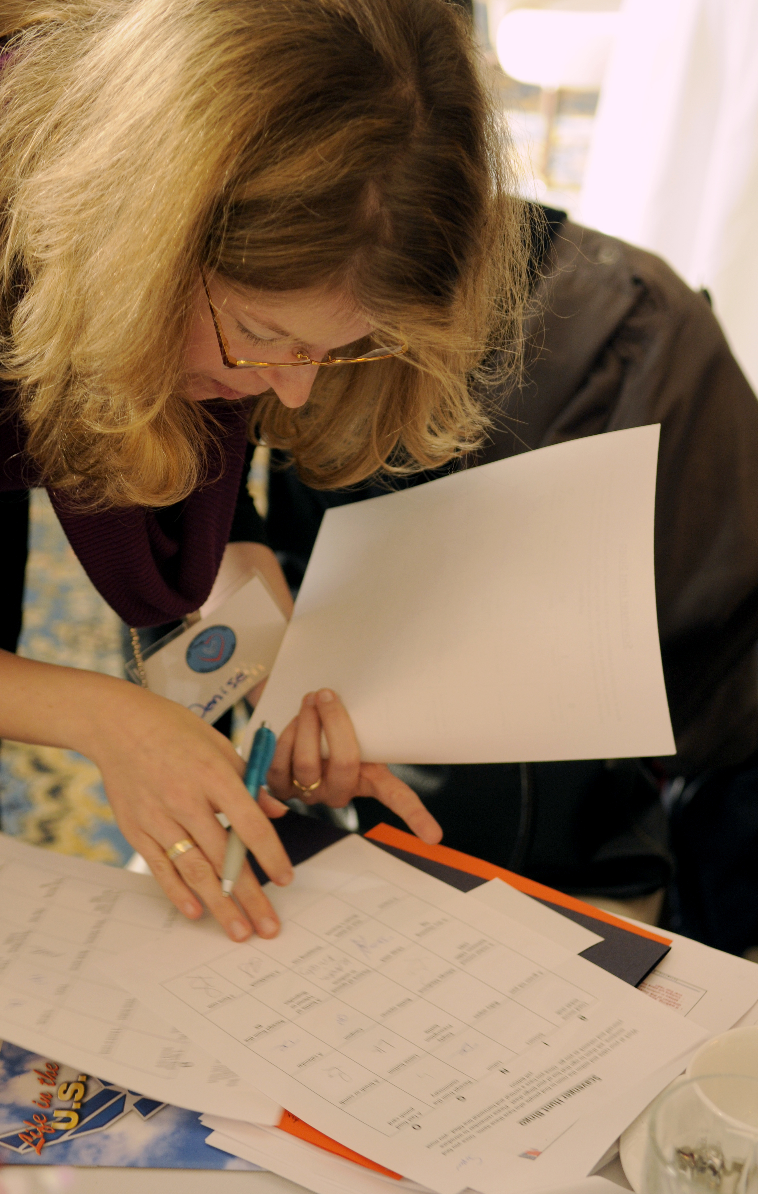 Denise Loveless, spouse of U.S. Air Force Tech. Sgt. Oscar Loveless, 51st Civil Engineer Squadron, gets involved in the Bingo game during the Heart Link seminar held on Ramtein Air Base, Germany, Dec. 2, 2009. The program is designed to introduce new military spouses to the Air Force way of life and how a supportive family plays a vital role to the success of the Air Force mission. (U.S. Air Force photo by Airman Desiree Esposito)