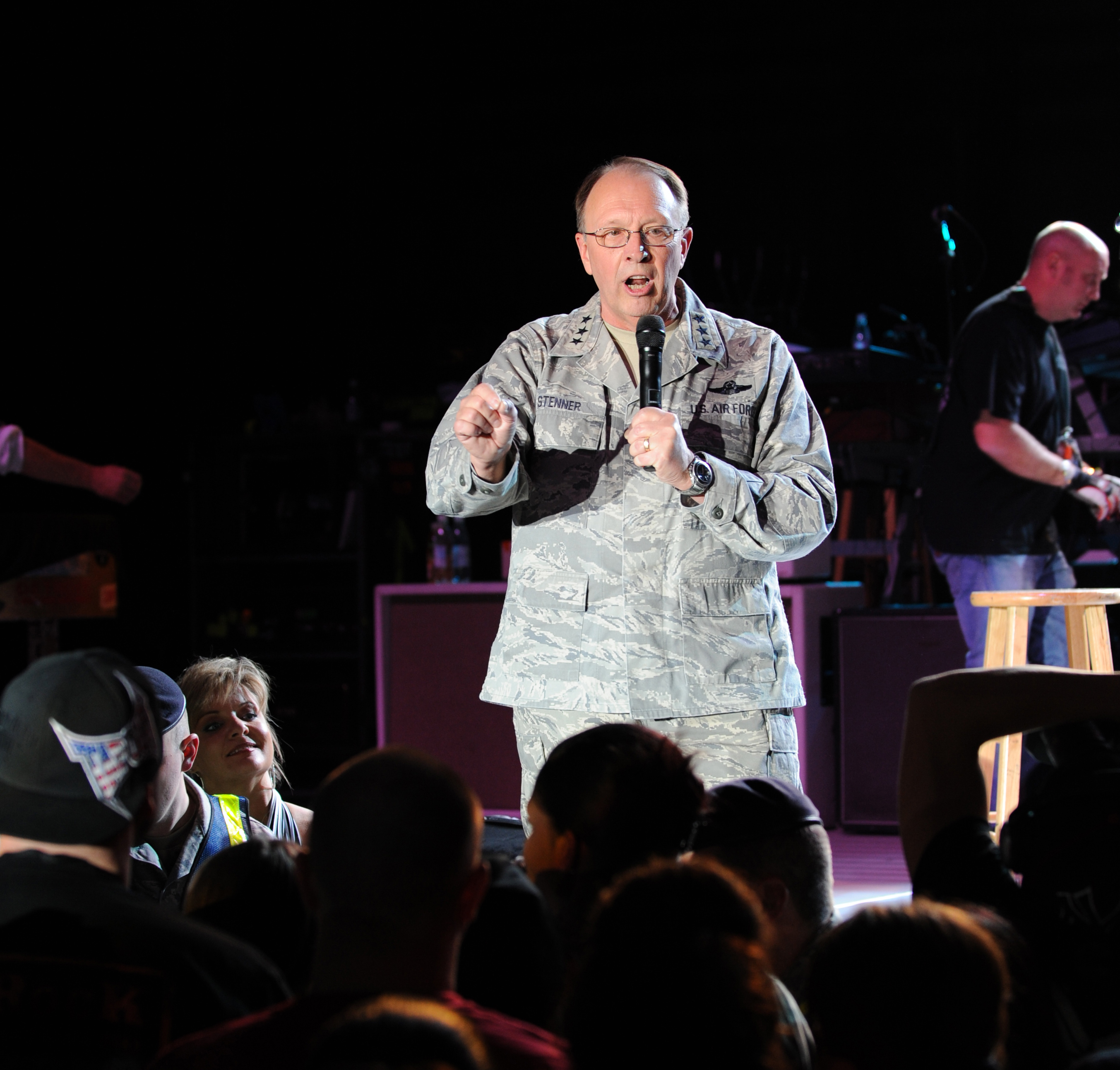 U.S. Air Force Lt. Gen. Charles Stenner, Air Force Reserve Command commander, takes the stage to thank military members and their families for the support and participation during the Tour for the Troops concert inside Hangar 1 at Ramstein Air Base, Germany, Dec. 9, 2009. Kid Rock, Jesse James and the Twisted Brown Trucker Band performed for Kaiserslautern Military Community members and their families to thank the troops and increase morale during the holiday season. They will be performing in Lakenheath Air Base, United Kingdom on Dec. 11, 2009 to finish their tour. (U.S. Air Force photo by Airman 1st Class Caleb Pierce)