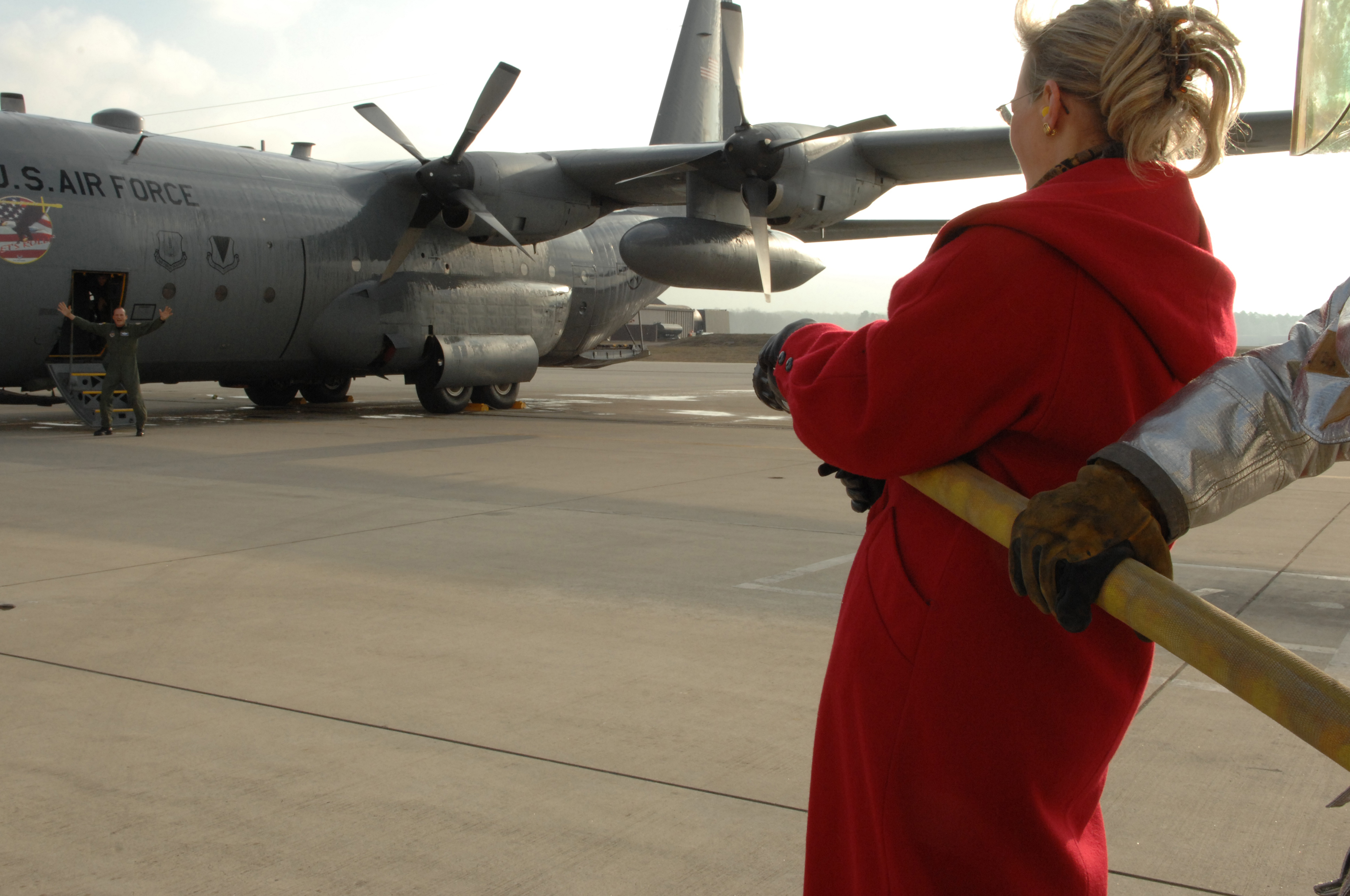 Terry Johnston (left) prepares to spray her husband, Brig. Gen. Rich Johnston, 86th Airlift Wing commander, upon arrival of his final flight in a C-130E Hercules Dec. 17. It is an Air Force tradition to be met with water on completion of the final 'fini' flight. (U.S. Air Force photo/Airman 1st Class Amber Bressler)(RELEASED)*