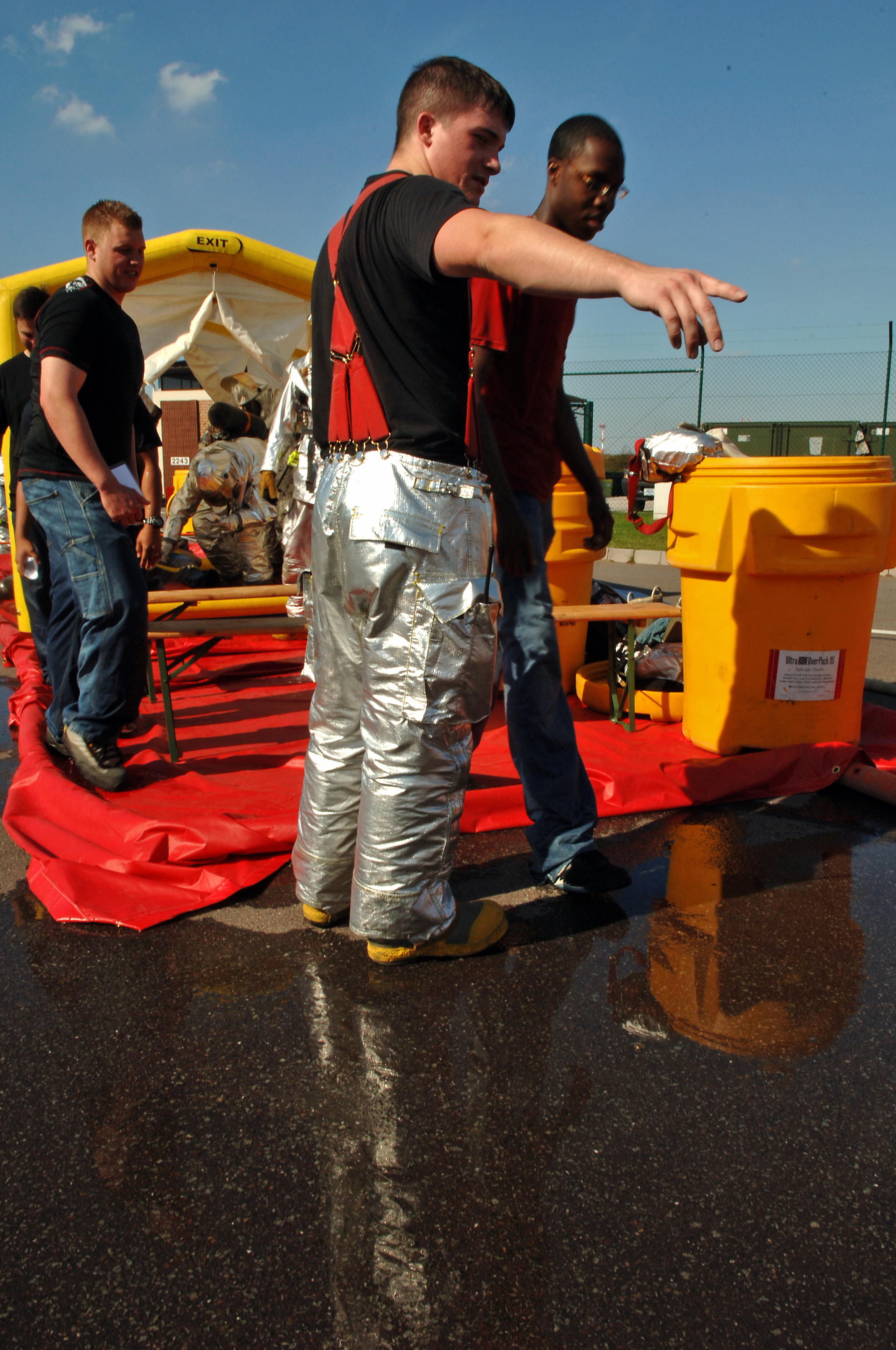 Airman 1st Class Joseph Murphy, 435th Civil Engineer Squadron, Fire Fighter, directs Airman 1st Class Tim Johnson toward the medical evaluation area after decontamination during a major accident response exercise on Ramstein Air Base, Germany, Sept. 22. The exercise was based on the collision of two trucks. One truck was carrying ammonia and the other was carrying radiological waste. This exercise tested the procedures of medical, fire, and law enforcement squadrons stationed at Ramstein as well as organization from the German community. (U.S. Air Force photo/Airman 1st Class Marc I. Lane)