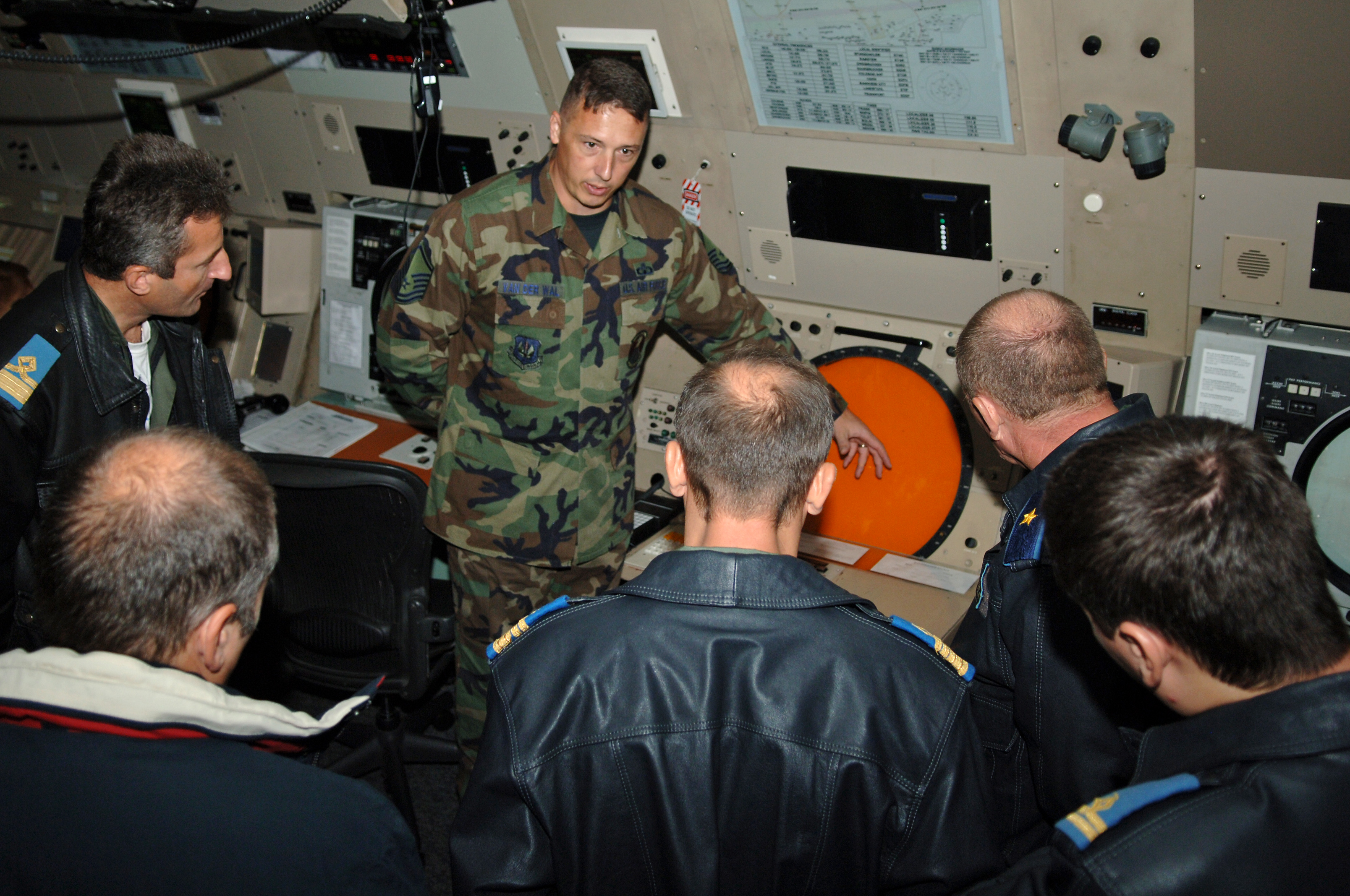 Master Sgt. Matthew Van Der Wal, 86th Operations Support Squadron assistant chief ground control approach controller, demonstrates the effective range of a radar scanning system to members of the Romanian Air Fleet on Ramstein Air Base, Germany, Sept. 11. Members of the Romanian Air Fleet visited Ramstein for seven days to gain an understanding of the U.S. Air Force operations in areas of civil engineering, logistics, maintenance operations, weather and base operations. (U.S. Air Force photo/Airman 1st Class Marc I. Lane)