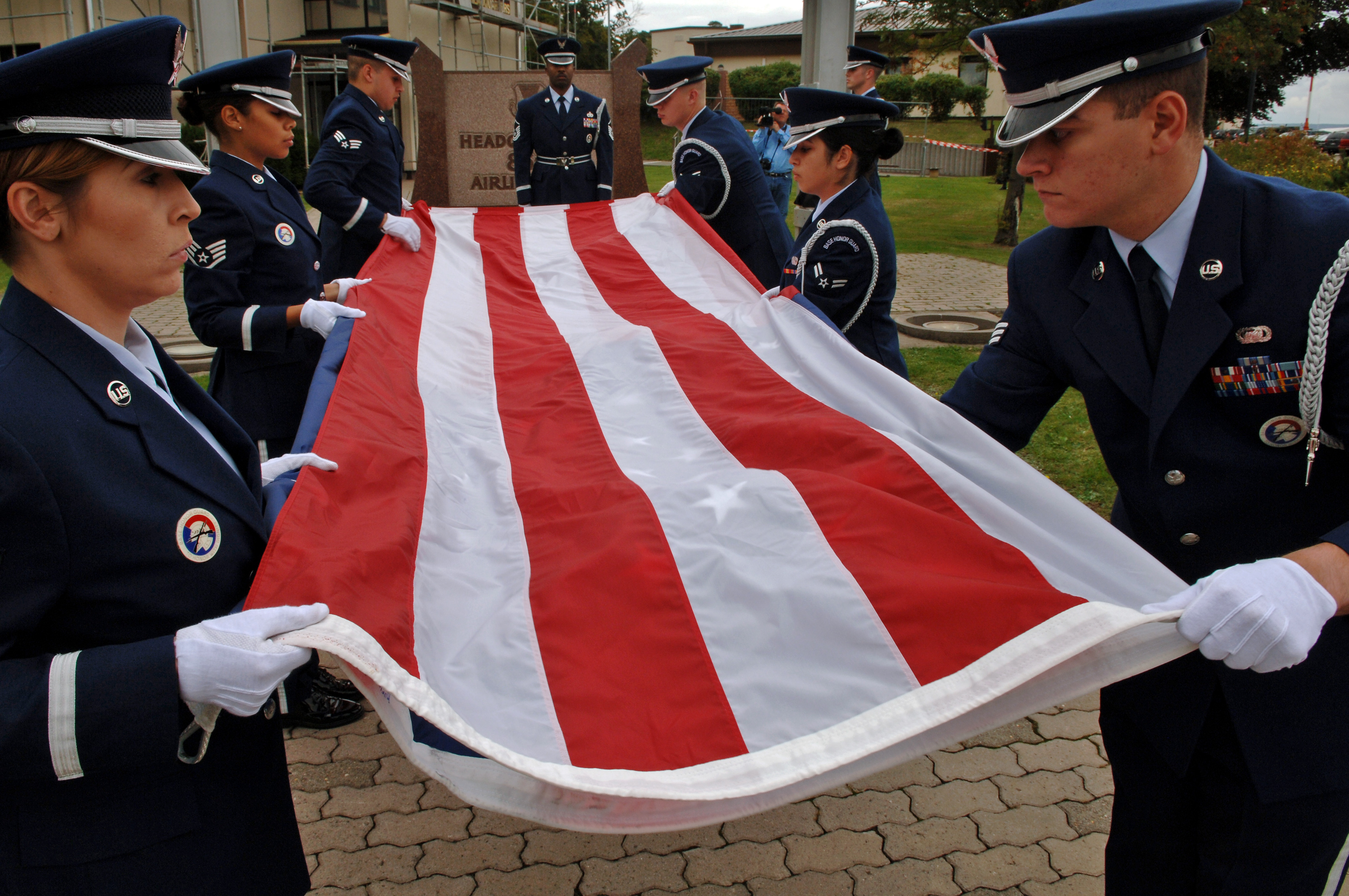 Members of the Ramstein Honor Guard fold the American flag during a retreat on Ramstein Air Base, Germany, Sept. 11 in memory of those who lost their lives in the attacks on America on Sept. 11, 2001. A total of 2,974 fatalities were caused by the attacks to the World Trade Center and the Pentagon. (U.S. Air Force photo/Airman 1st Class Marc I. Lane)