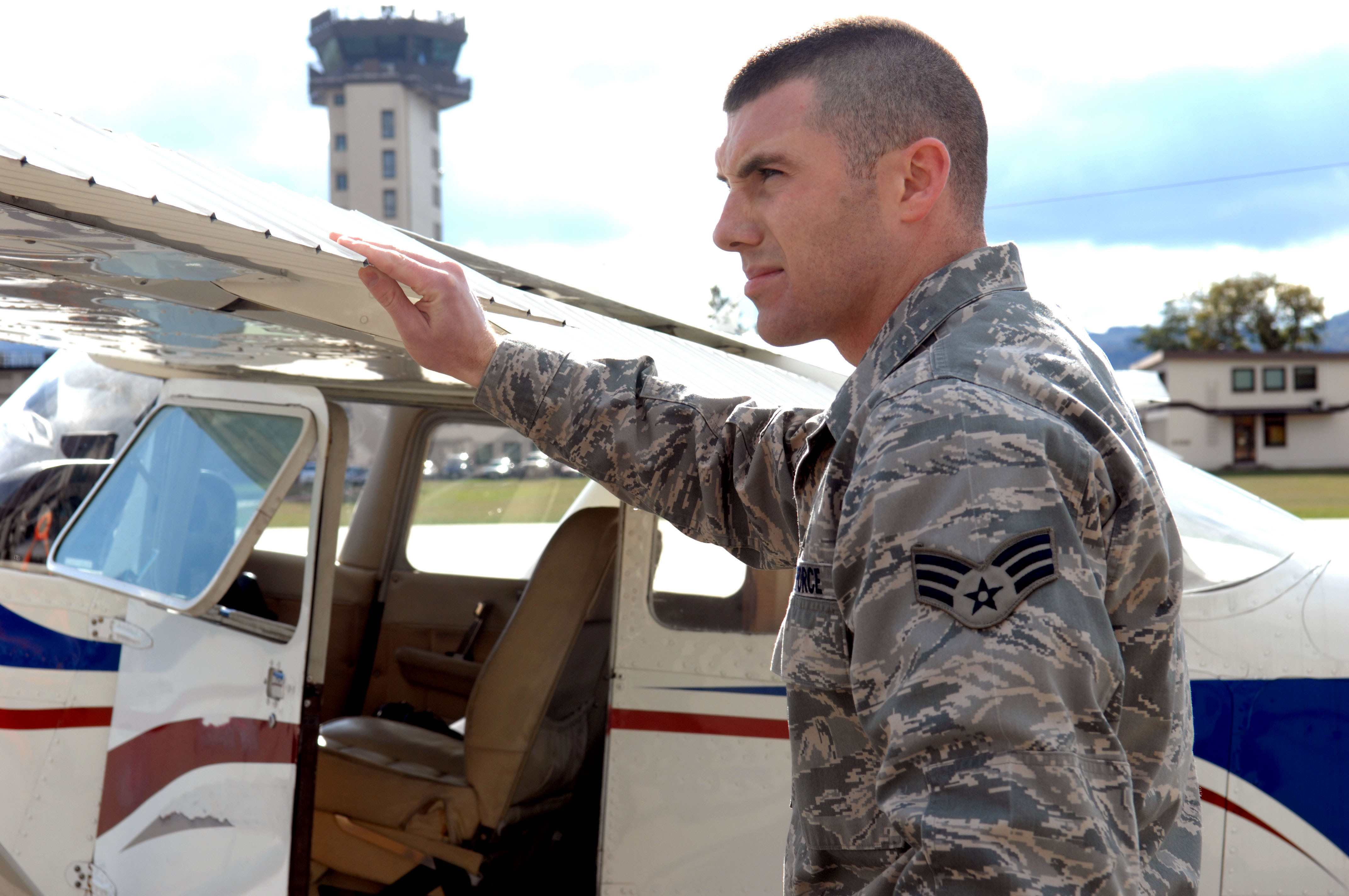 U.S. Air Force Senior Airman Jacob Haines, 435th Air Mobility Squadron Aircraft Maintenance Technician stands next to a Cessna C-172 on Ramstein Air Base, Germany Oct. 14, 2009. Senior Airman Jacob Haines was presented with a 19th Flight of Daedalian Aviation Incentive Certificate making him the first airman awarded one hour of flight time with the Coleman Aero Club which is the only military nonprofit aero club in Europe. (U.S. Air Force photo by Airman 1st Class Brittany Perry)