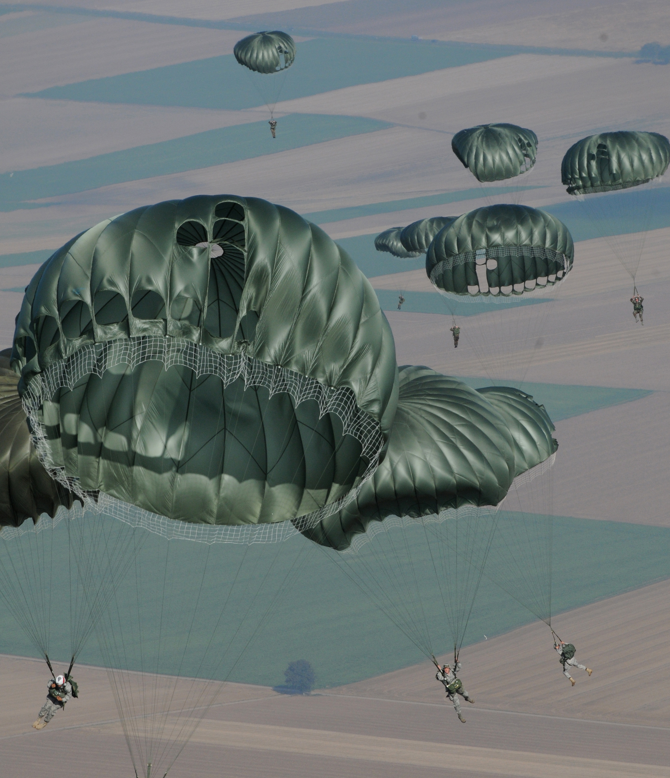 U.S. Forces along with four NATO countries parachute over Bunker drop zone in southwestern, Germany on Aug. 12, 2009. U.S. soldiers and airmen performed a combined airborne jump with four other NATO countries. German, Italian, Belgium, and Dutch army attended the airborne jump during NATO Jump Week. (U.S. Air Force photo by Airman 1st Class Grovert Fuentes-Contreras)