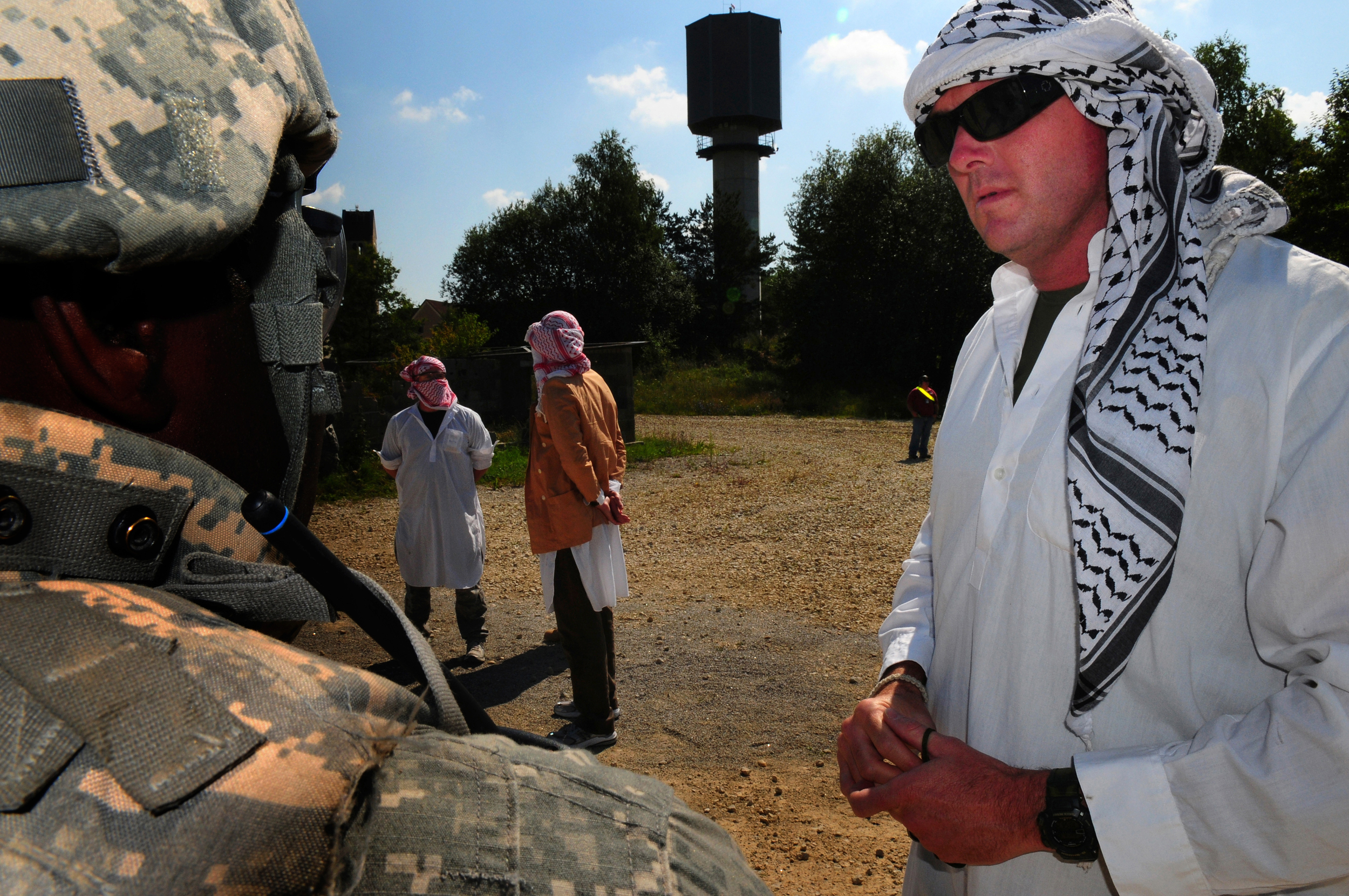 A member of the U.S. Army military police, from the Engineer Troop, Vilseck, Germany, questions an elder of a villiage played by Hospital Corpman, Petty Officer 2nd Class, Ben Plunkett, as party of a simulated close air support mission during Allied Strike at Hohenfels, Germany. Allied Strike a multi-service, multi-national exercise presents realistic scenarios geared specifically toward TACP to hone skills before deploying. (U.S. Air Force photo by Staff Sgt. Jocelyn Rich)