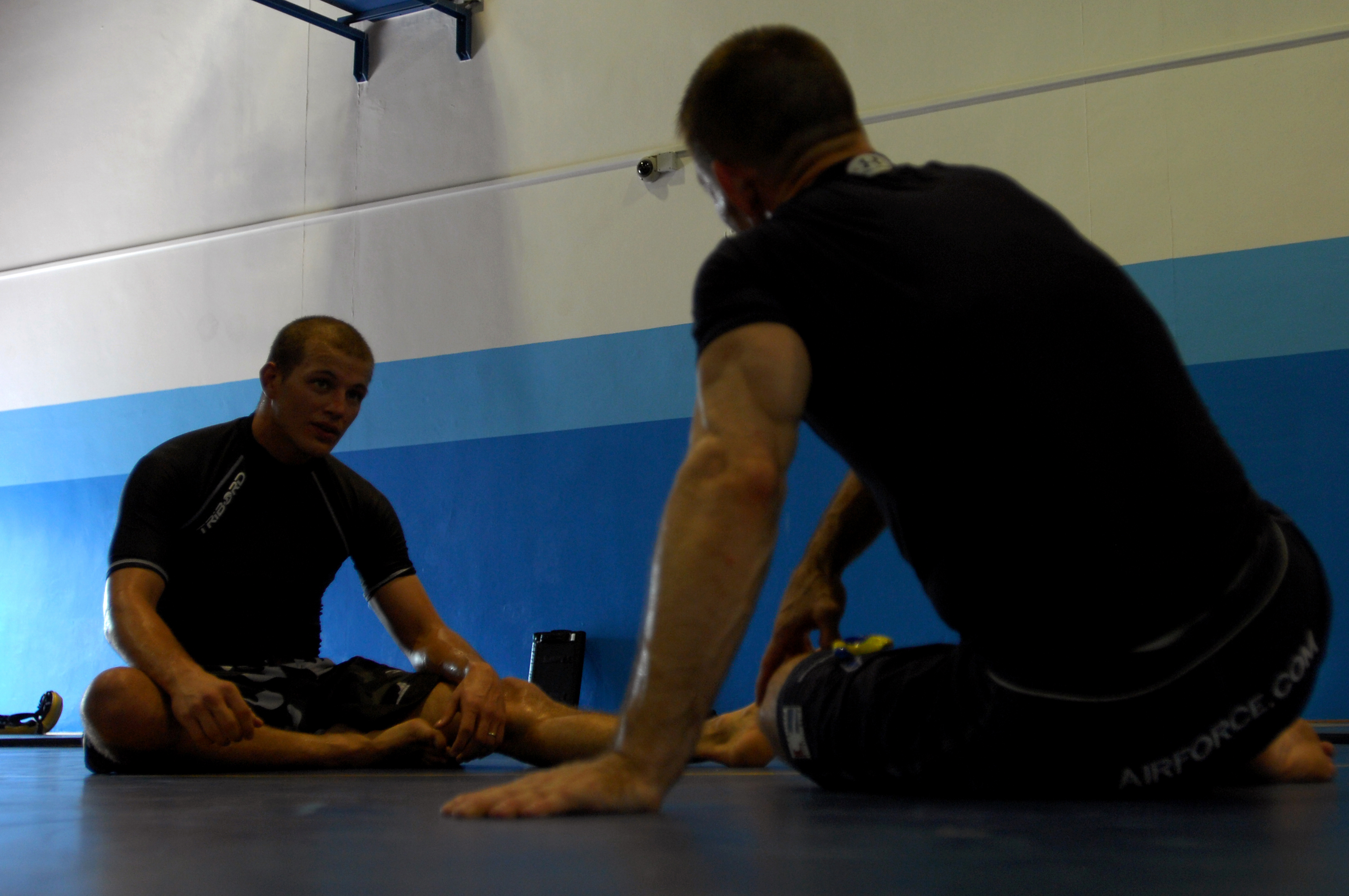 U.S. Air Force Staff Sgt. Anthony Durnell, 786th Security Forces Squadron training instructor (left), and Master Sgt. Stephen Horton, 435th Air Base Wing Public Affairs noncommissioned officer in charge of operations, discuss key points of training after a grapple secession June 25, 2009, Ramstein Air Base, Germany. Both Sergeant Horton and Sergeant Durnell participate in Mixed Martial Arts and have pristine records. (U.S. Air Force photo by Senior Airman Kenny Holston)(Released)