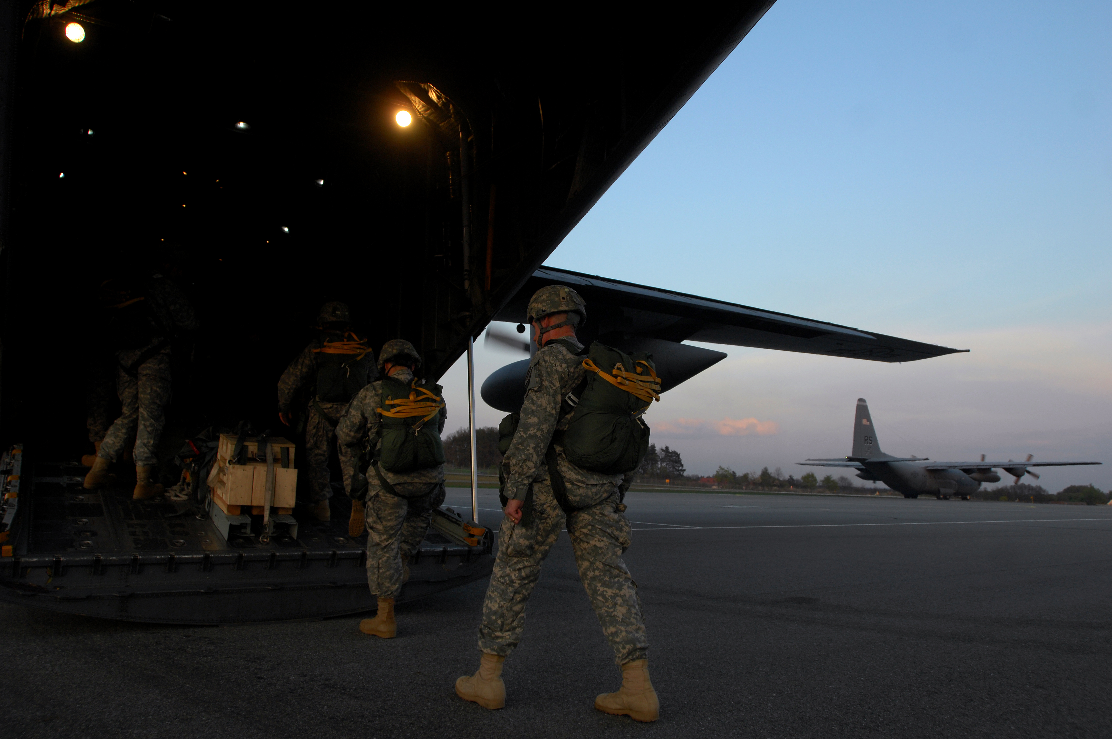 U.S. Air Force and Army paratroopers board a Ramstein C-130E for a personnel night drop, April 20, 2009, Grafenwoehr Army Airfield, Germany. Army and Air Force paratroopers participated in a joint airborne drop over southern Germany in an effort to keep jump masters and paratroopers jump qualified. Both services often work together on personnel drops to achieve success. (U.S. Air Force photo by Airman 1st Class Kenny Holston)