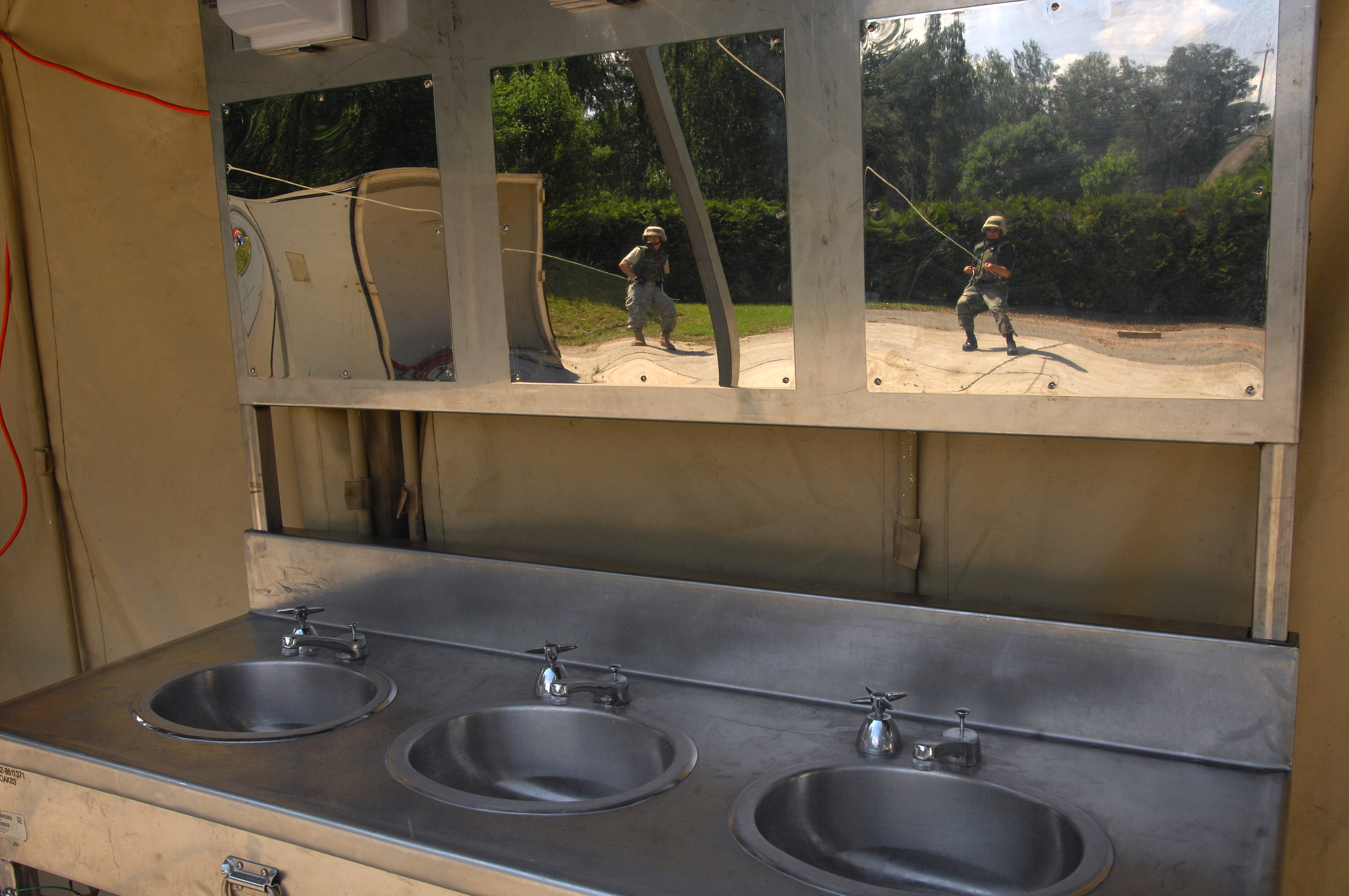 U.S. Air Forces in Europe Airmen work to set up a field deployable shower and shave unit June 10 during a two-week Silver Flag exercise held at Ramstein. The exercise prepares Airmen for upcoming deployments. The core focus of the exercise is to teach Airmen how to set up a sufficient bare base and be able to adapt and adjust to any situation they might come across while being deployed. Photo by Airman 1st Class Kenny Holston*