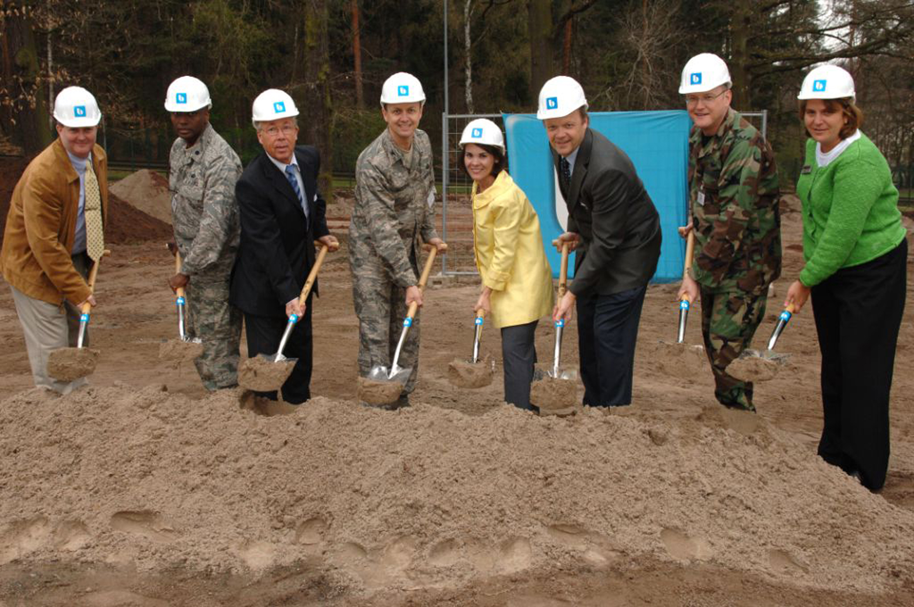(Left to Right) James Fitzpatrick, 435th Civil Engineering Squadron deputy commander, Lt. Col. Ben Ward, 435th Services Squadron commander; Herr Herrman, Kaiserslautern Bilfinger and Berger branch chief; Col. Earl Matthews, 435th Air Base Wing commander; Ami Prince, Vogelweh Child Development Center director; David Quinn; U.S. Air Forces in Europe Services chief of programs; Col. Philip Andrews, 435th Mission Support Group commander; Dorothy Choate, Family Member Programs Flight chief; participate in a ground-breaking ceremony for the new playground at the CDC on Vogelweh, April 22. ( US Air Force Photo by Airman 1st Class Tony R. Ritter ) ( Released )