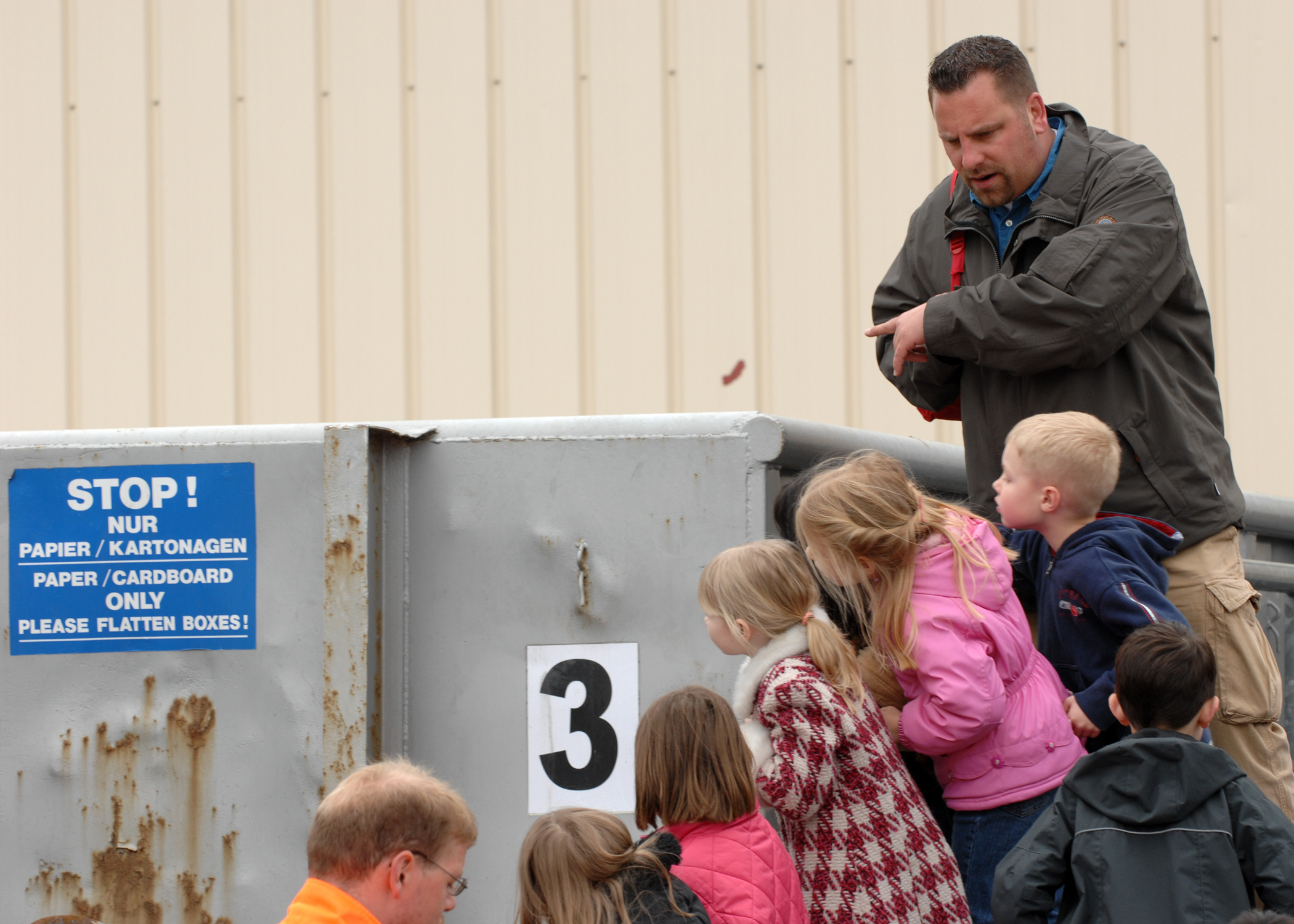 Tilman Kalkbrenner, first-grade German immersion teacher, shows his class where to put paper and cardboard to be recycled April 22 at the Ramstein Recycling Center. Photo by Airman 1st Class Nathan Lipscomb*